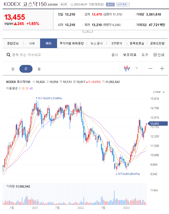 오늘 장이 굉장히 강했다. 특히 코스닥이 강했다. 에코프로의 상승빔과 2차전지의 상승이 코스닥지수를 견인했다. 벌써 880pt이다. 계속 생각중이지만 만기일이 없는 코스닥 인버스 ETF를 손절하기엔 뭔가 아쉽다. 시간과의 싸움이라는 생각이 계속 들기 때문이다. 코로나 고점을 돌파하고 올라갈 것이라는 생각이 아직은 안들기 때문이다. 상방이 15,000원 정도로 막혀있다고 본다 아주 강한 매물 벽이 있다.