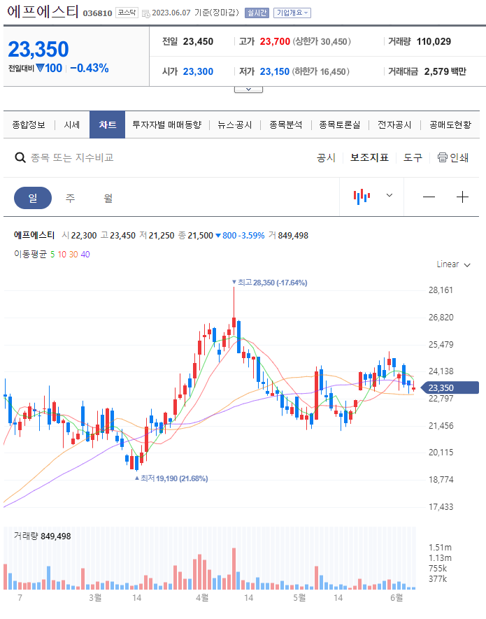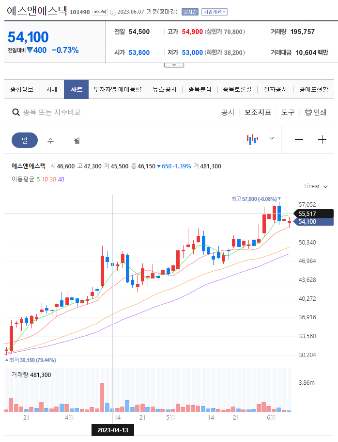 둘 다 들어가기 애매한 차트같다. 에스앤에스텍은 30일선 터치하는 5만원이 괜찮아 보이고... 에프에스티는 모르겠다. 변동성 축소가 이뤄지고 있는것 같은데 차트가 안 이쁜 느낌이다.