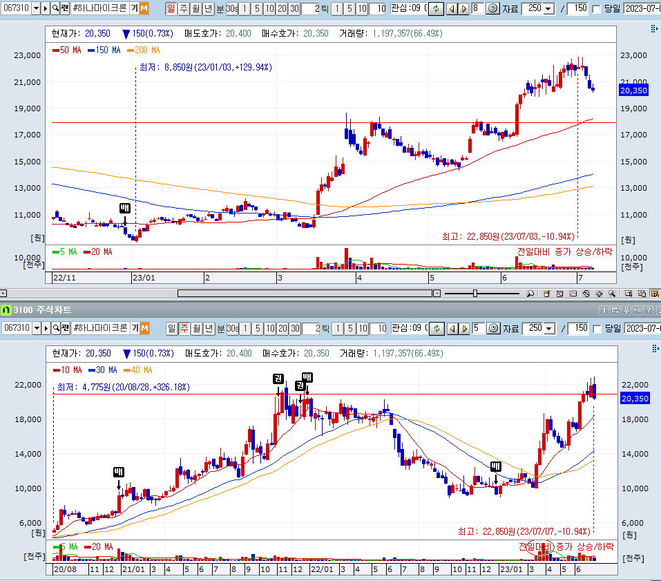 하나마이크론은 50일 이평선과는 거리가 있지만 의미 있는 가격 지지선 2만 원선까지 와있다. 하지만 50일 이평선과는 거리가 있기 때문에 두고 보고 VCP든, 풀백이든 자리를 기다리는 게 맞을 듯.