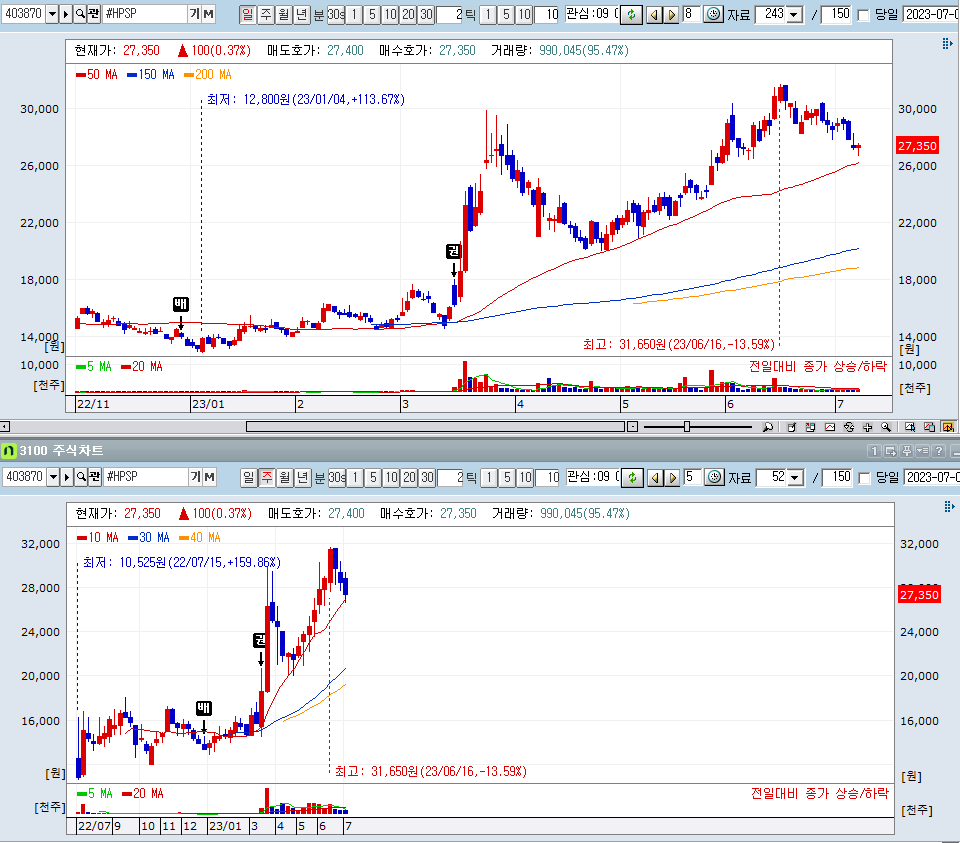 많이 오른 종목 들은 흠... 고소공포증이 생기는 위치긴 하다. HPSP도 50일선과 만나고 있으나 패턴이 안정적으로 형성되고 있다고 보기가 어려워서 망설여지긴 함.