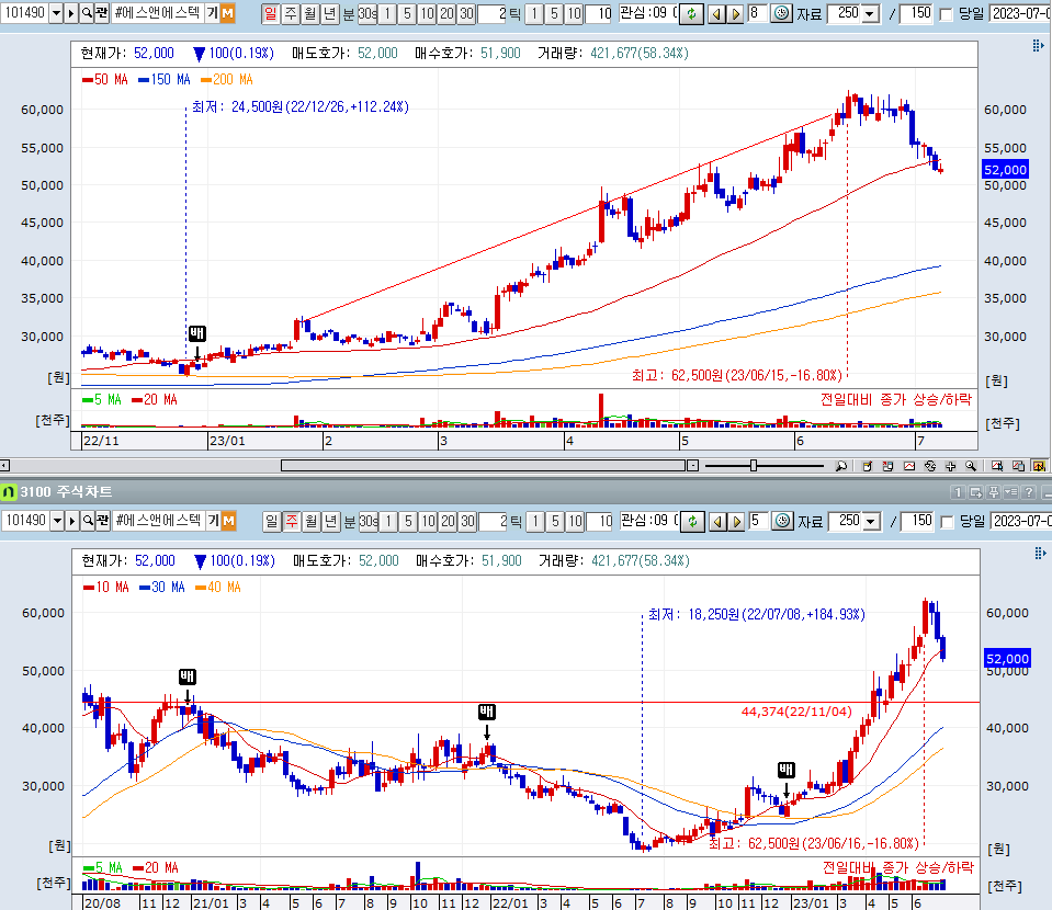 넥스틴은 보유 중이지 않고, 에스앤에스텍과 하나마이크론은 보유 중. 매수 1순위는 에스앤에스텍, 그다음넥스틴으로 생각 중인데 공모주 청약에 자금이 묶여있어서 강제로 신중하게 관찰 중. 넥스틴은 상승이 짧게 가는 것이 좀 아쉬워보임. 에스앤에스텍 5만 원 자리, 넥스틴은 7만 원, 하나마이크론은 1만 8천 원.