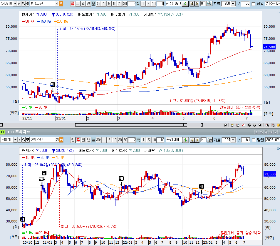 넥스틴 : 의미 있는 지지선 7만 원과 50일 이평선이 만나있다. 2번째 베이스 구간이 형성되는 중이라고 보이는데, 상승이 베이스 형성 후 너무 짧은 느낌이 있다.