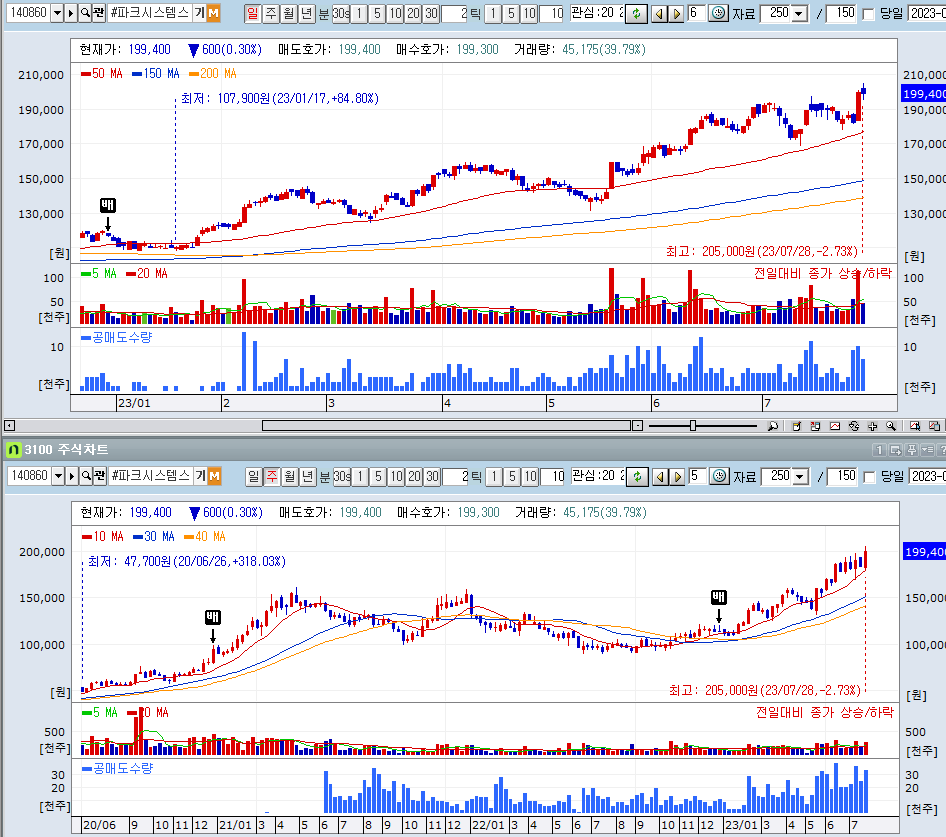 파크시스템스라는 종목의 상승세가 단단하다. 반도체 쪽인데 매출 흐름도 좋다. 공부하고 지켜봐야할 종목 같다. 차트상으로는 150일선 대략 15만 원 터치해 주면 좋은 매수 기회일 것 같은데