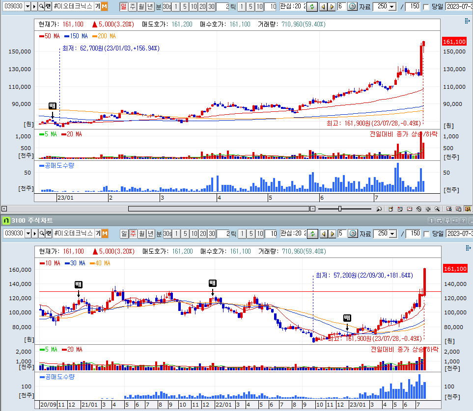 보유 중인 반도체 흐름들이 수요일 이후로 좋아졌다. 넥스틴은 신고가를 돌파. 축축. 하나마이크론도 나쁘지 않다. 월덱스와 에스앤에스텍의 흐름은 좋지 않다. 거래량이 터진 이오테크닉스도 굉장히 이쁜 상황이다. 놓친게 아쉽다.한때 명품주식이였던 리노공업도 흐름이 좋아졌다.
