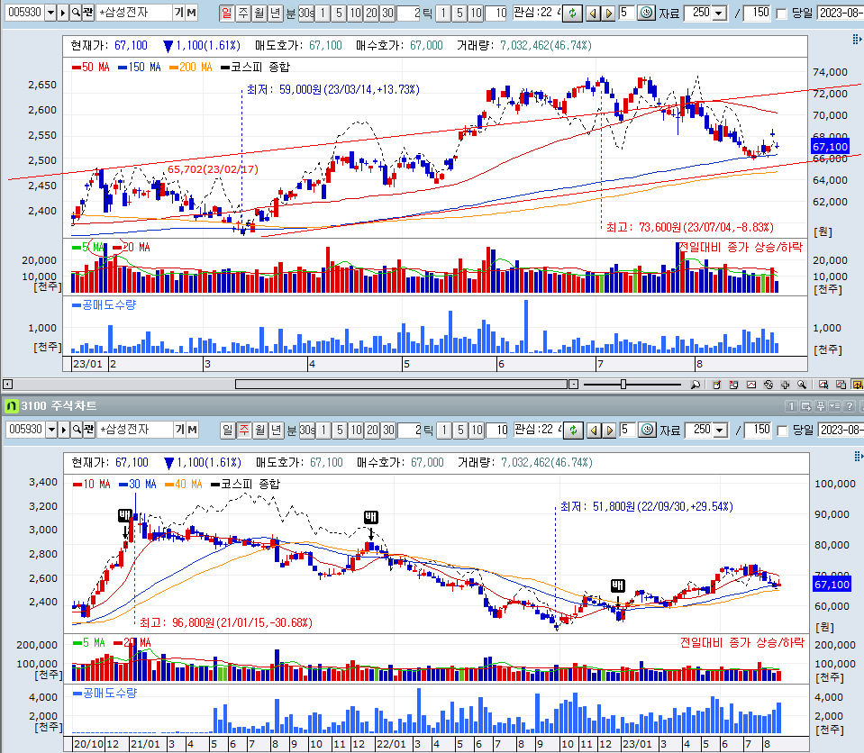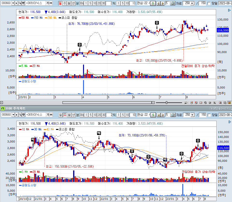 삼전보다는 하이닉스의 주가차트가 이뻐보인다. 삼성에서 HBM 관련 소식이 나와야 좋은 흐름을 기대할 수 있겠다.