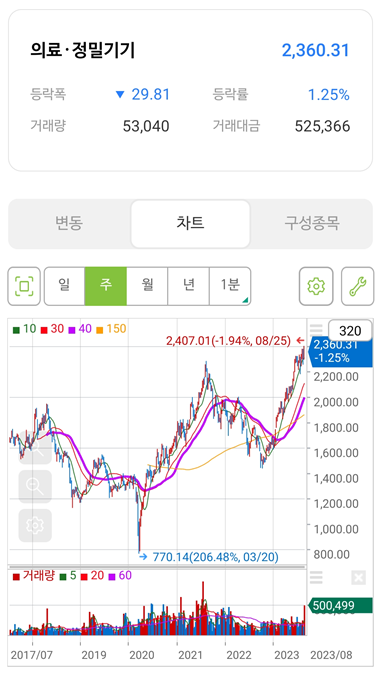 업종차트를 매주 루틴에 넣고 분류하고 참고해야겠다. 섹터로 분류하기에는 노이즈가 너무 많지만 업종차트로 본다면 큰 흐름을 놓치지 않고 작은 흐름에 혹하지 않을 수 있을 것 같다. HTS에서는 오히려 너무 짧은 기간과 이평선을 안보여줘서 MTS로 막일하는 게 귀찮지만... 이 속에 있는 종목들을 놓치지 않는 것도 의미가 있을 것 같다.