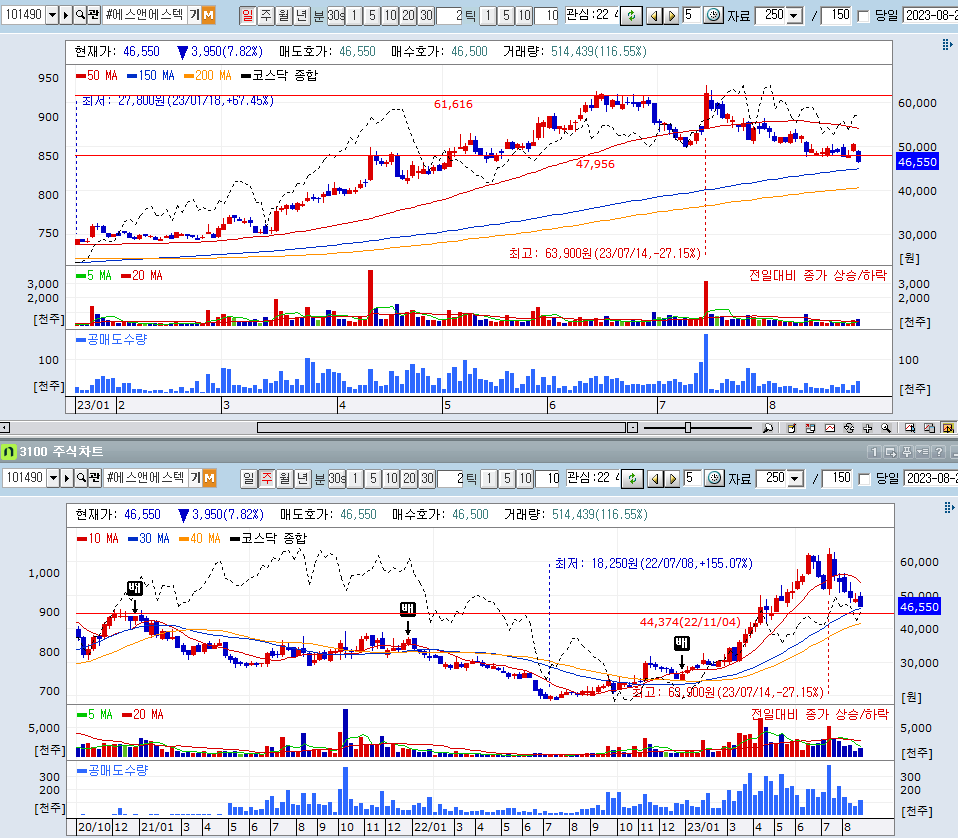 보유 종목의 차트는 나쁘지 않은데, 에스앤에스텍의 차트가 조금 안좋게 흘러가고 있다. 48,000원 정도를 보고 있었는데 어느새 주가가 내려왔다. 150일 선과 만나려고 하는데, 이때 반등을 주지 못한다면 손절을 하고 나오는 것이 좋아 보인다. 여기에서 이평선을 지키지 못한다면 너무 고점대비 많은 조정이라는 생각이 든다.
