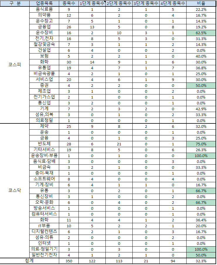 기다리고 기다리던 반도체 타임이 왔다. 개인적으로는 8월 31일이 지나자마자 2차 전지에 더 이상 호재가 없기에 매수의 기운이 반도체나 의료 쪽으로 퍼져나간 것 같다. 짜놓은 듯 좋은 뉴스들도 터져 나오면서 반도체 주식들이 크게 올랐다. 코스피 200은 150일선을 찍고 올라왔다. 코스닥 150은 50일 선위에서 아직 노는 중인데, 앞으로의 흐름이 주요할 것으로 보인다. 2차 전지 인버스 ETF가 나온다면 어떤 식으로 흘러갈지... 업종별로 종목수분석을 추가해 보았다. 4단계 종목이 많은 것은 업종은 업종전체에 온기가 돈다고 보기 어렵다고 해석할 수 있다. 하지만, 너무 업종분류가 대분류로 되어있고 그 속에서도 특징별로 쏠림현상이 발생하기 때문에 단순 참고용이다. 차트를 훑으면서 느낀 것은 바이오와 게임주가 안 좋다.