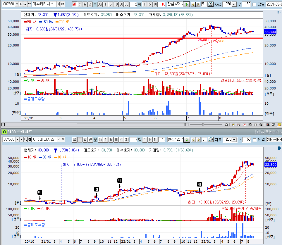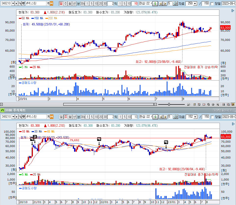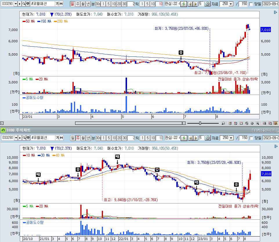 보유종목 말고 눈에 띄는 종목은 사실 또 반도체 종목이 주를 이룬다. 의료기기는 너무 많이 올라서 진입하기 늦었다고 생각이 들어서. 전력기기도 마찬가지. 하지만 업종이 쏠려있으므로 관심을 두고 풀백에서 매수할 수 있도록 관심을 지속적으로 가져야 한다. 여기부턴 사실 오직 차트만으로 선별하였고 매수 고려 시에는 더 많은 내용들을 살펴봐야 할 것이다. 시장의 지혜를 존중하고 내가 그보다 앞서기 어려운 부분은 차트를 통해 참고하는 게 빠를 때가 많다는 것을 느낀다. 차트가 이뻐서 봤던 메지온은 MSCI 지수편입 이슈고 코웰패션은 인적분할이슈.