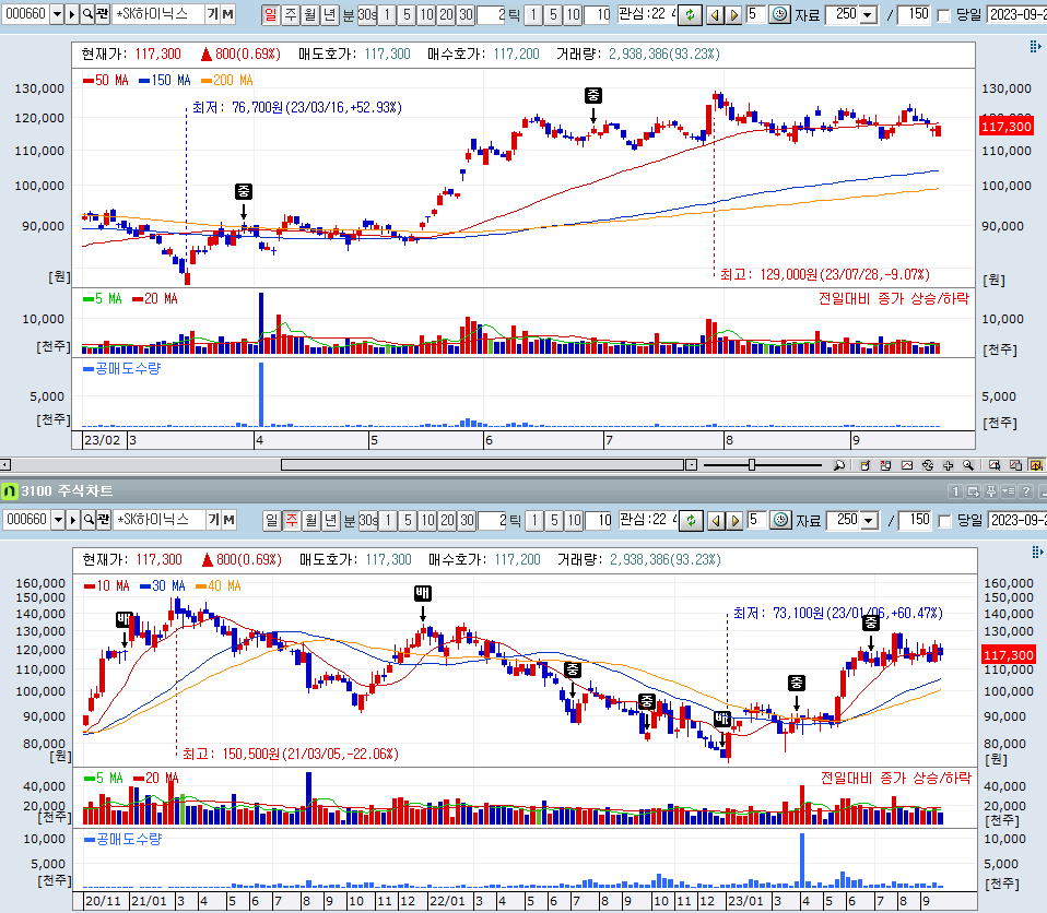 반도체 종목은 대부분은 크게 하락하여서 50일 이평선 밑, 150일 이평선 위에서 머무르는게 일반적이다. SK하이닉스의 주가흐름은 상대적으로 견고하다.