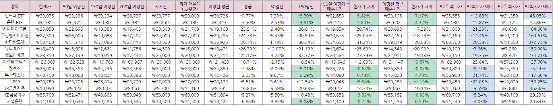 관망하면서 체크리스트를 복기해보자. 주가관련 자료를 기록해보니, 매물대에 막혀 박스권을 형성하고 있는 지지선이 탄탄한 종목들이 현재 잘버티고 있다. 상승할때도 무겁기는 하였다. 최고가대비 하락이 25%