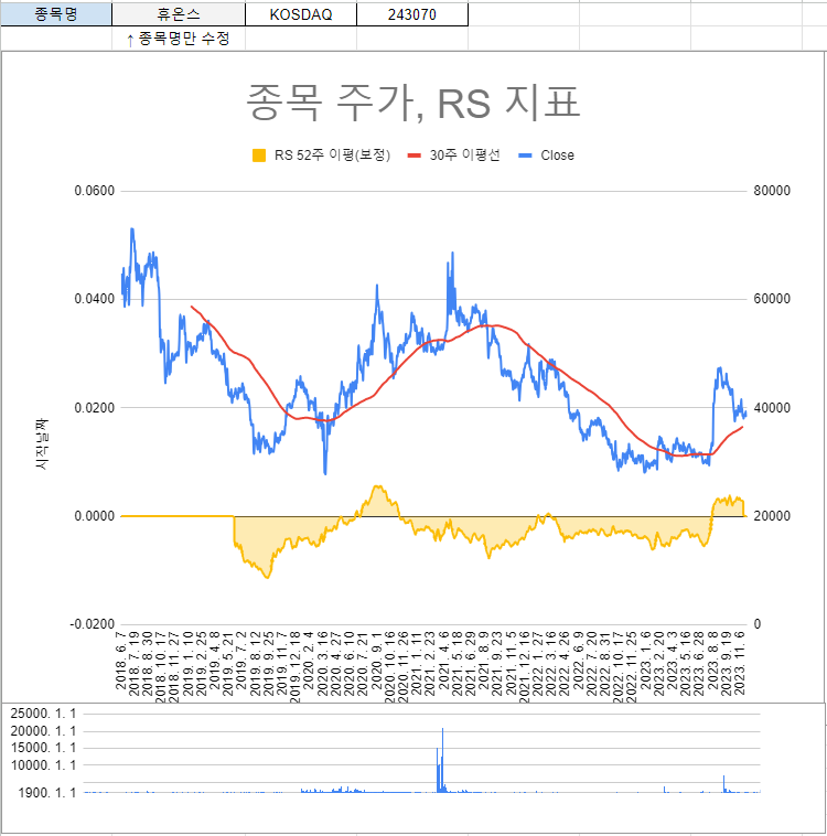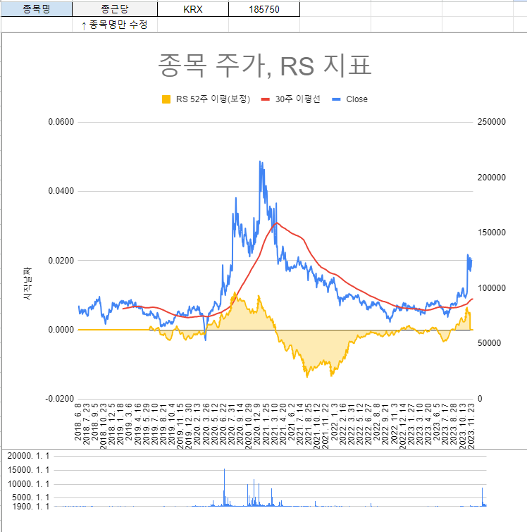 3) 2단계 (진입) : 1단계에서 2단계 진입을 시도하고 있는 업종 - 헬스케어, 게임등. 2단계를 조금 더 빠르게 진입할 것으로 예상되는 헬스케어에서 주도주를 찾는 작업이 필요함. 이미 2단계 중간인 종목은 한올파이오파마, 케이아이엔엑스, 휴메딕스, 펩트론. 2단계 진입인 종목은 셀트리온, 셀트리온제약, 종근당, HK이노엔, 대웅 등... 그중 충분한 조정을 거치고 적당한 시가총액, 적은 매물벽을 보유 중인데 큰 거래량을 동반하여 상승한 종목을 픽. 종근당, 휴온스, 바디텍메드, 셀트리온제약정도가 1.5 티어로 RS까지도 무난해 보임.