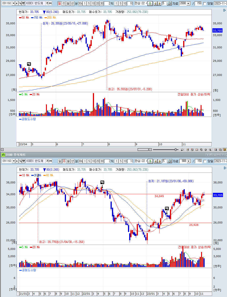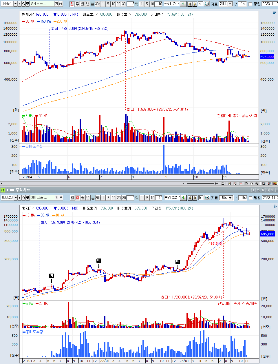 3-2. 하락업종 : 2차 전지, 엔터주. 2차 전지 ETF 및 관련종목들 150일 or 200일 이평선 돌파실패한 것으로 보이며, 특히 에코프로형제들이 지지부진한 모습을 보여주는 중. 포스코도 비슷한 주가차트를 보여주며 확실히 업종 전반적으로 동일한 흐름을 보여줌. 결과적으로 주도업종에서 2차 전지가 쫓겨난 것으로 보고 있으며, 현재 포지션 유지관점...