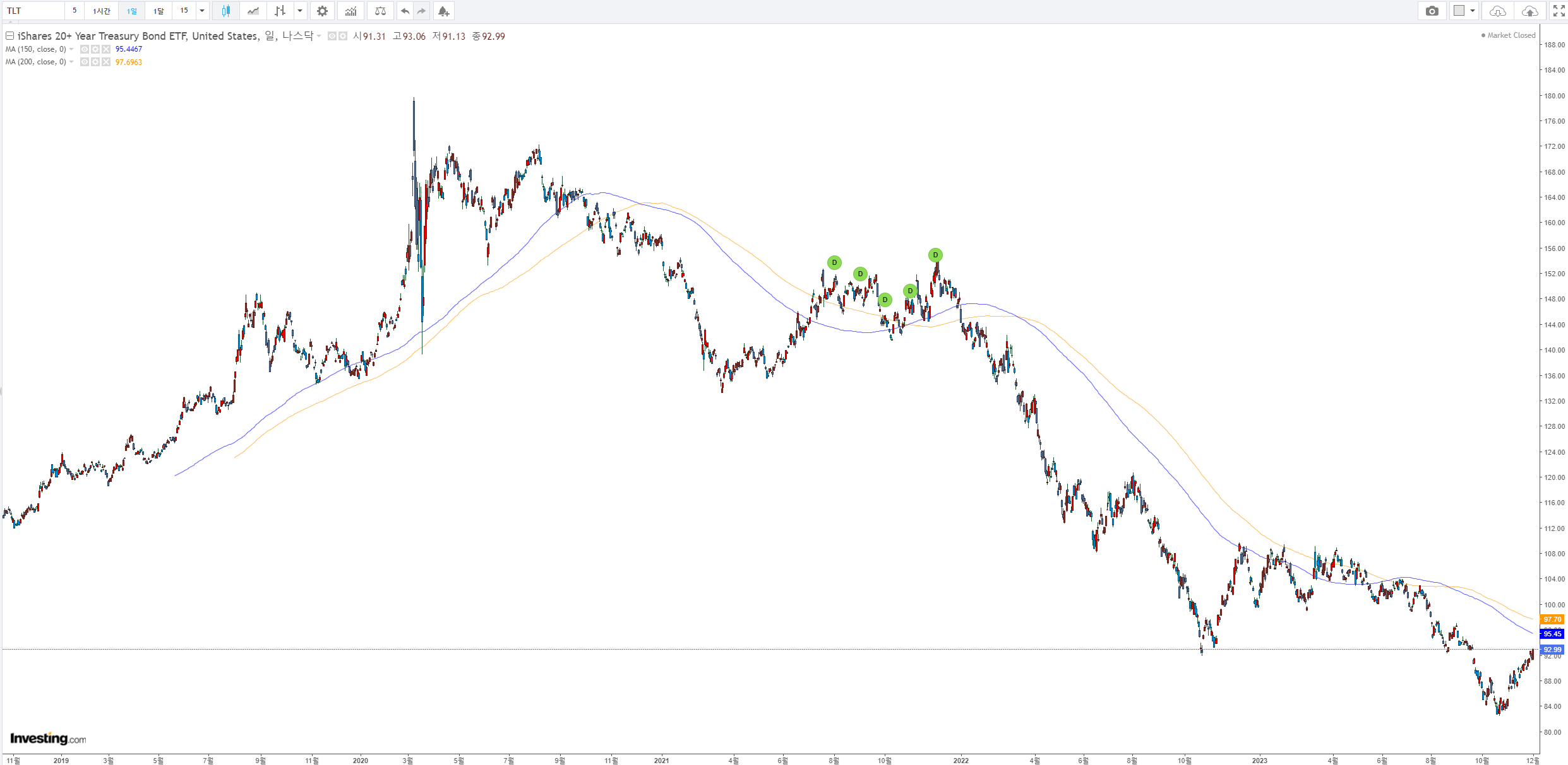 1단계에 진입하려고 하는데 전 저점을 돌파하려는 포습을 보여주고 있다. 하지만 아직 매수시기로는 이르며 적어도 이평선이 평평해지고 박스권에서 안정적으로 움직이는 것을 보고 매수에 동참. 처음에는 TLTW 일부 매수하여서 이자비용을 충당하고 나머지는 한국상장된 미국채 30년물 매수예정. 이후 2단계 진입 후에는 고민.