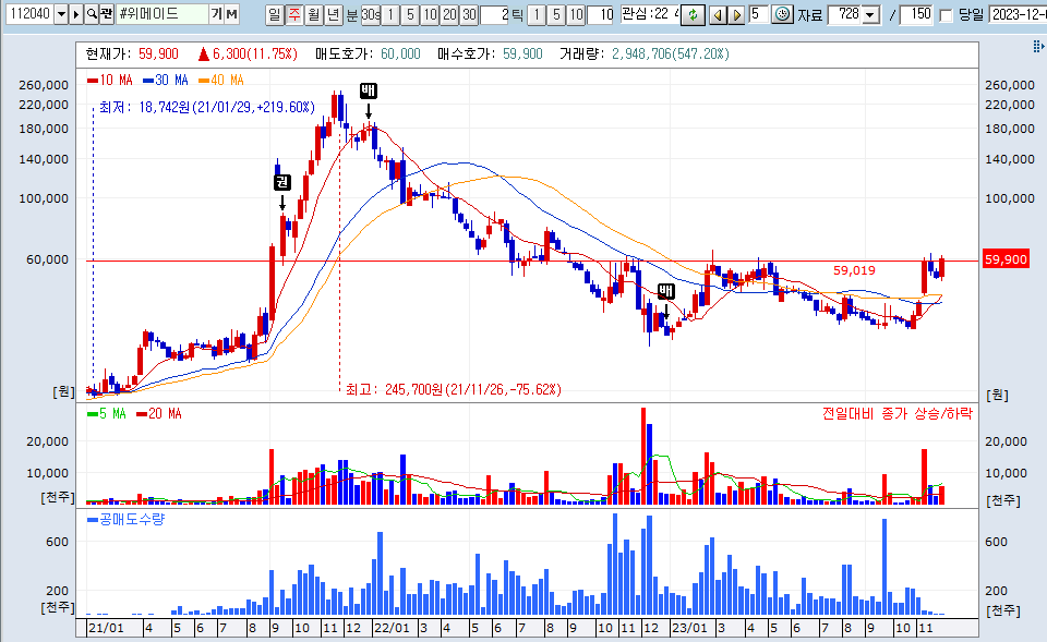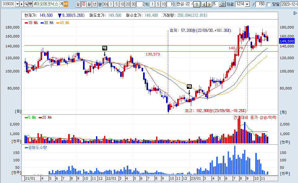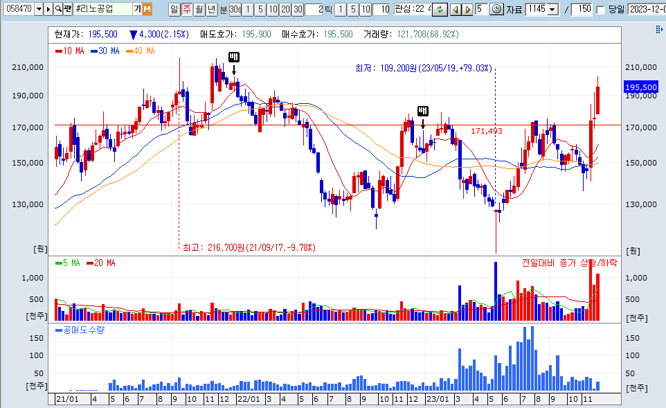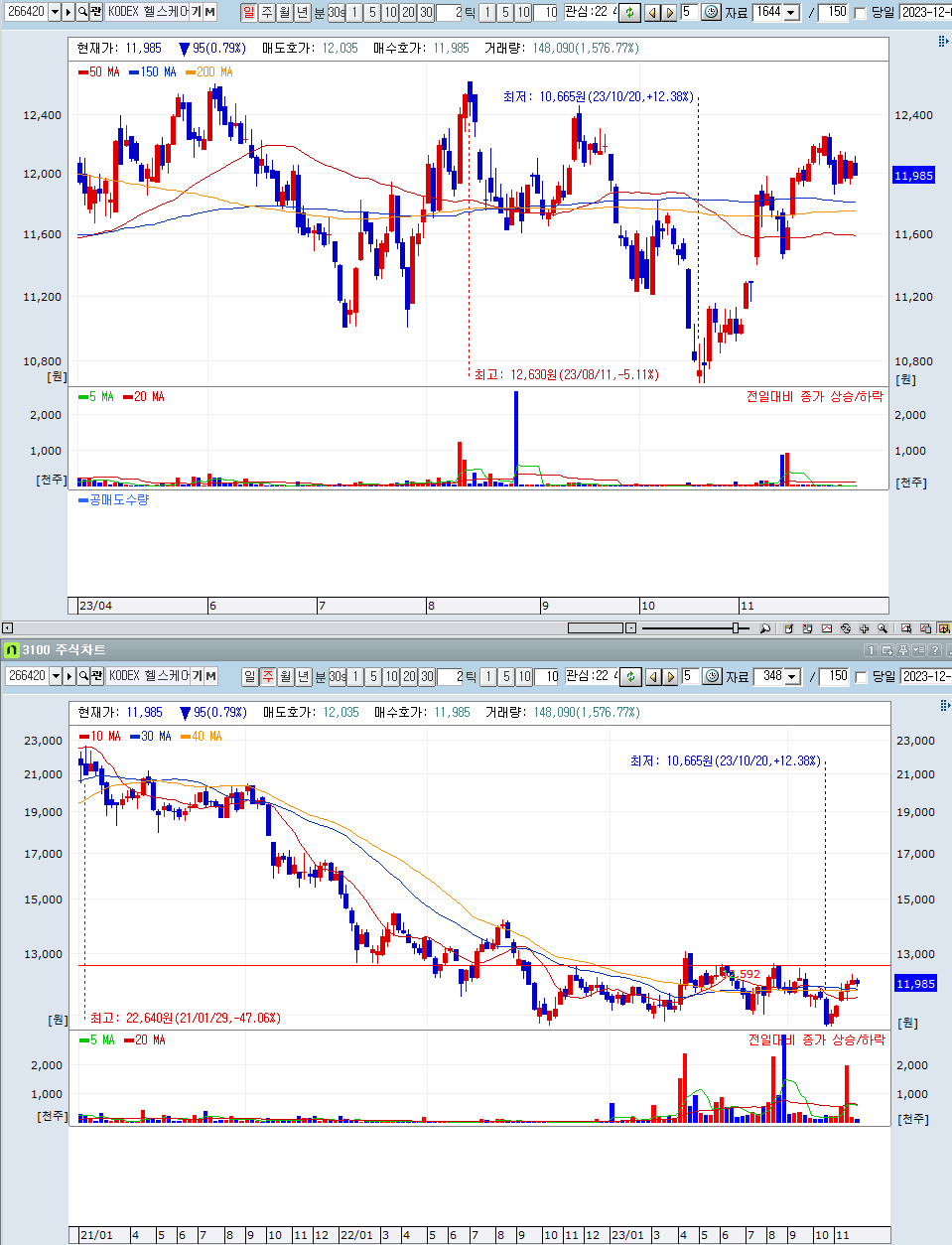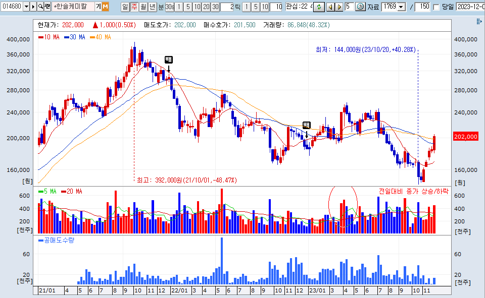 농심이 3단계로 진입한게 특이점. 2차전지 종목들. 인버스 ETF의 항뱡이 생각보다 쉽게 정해지지는 않는다. 개인적으로는 오른쪽 어깨라고 판단 중이다. 150일, 200일 이평선 돌파실패를 계속적으로 보여주면서 숨고르기를 하는 것 같기도 하다. 2번째 도전 중. 4번 정도까지 도전을 할수도 있다고 마크는 이야기했다. 시간이 생각보다 걸릴 수 있겠지만, 이평선이 평평해지고 하락하는 순간이 올 것이다. 조금 진입시기는 빨랐던 것 같고 투입비중이 컸던 것은 아쉬운 점. 공매도 금지가 내년 6월로 정해져있는 부분도 결국 2차전지 투심이 상반기가 지나갈수록 안좋아질수 있는 점이다. 누가 먼저 사냐게임은 누가 먼저 파냐 게임으로 바뀔 가능성이 있다. 에코프로비엠의 40조 공시가 나오면서 다른 종목에 비해 크게 상승하였다. 어찌되었든 내 감당능력보다 비중을 크게 담은 것은 반성하는 점이다. 다행이 저번주 22,000원에 매수한 물량은 수익권이라 적당할때 분할매도하고 비중을 살짝 낮춰야겠다.