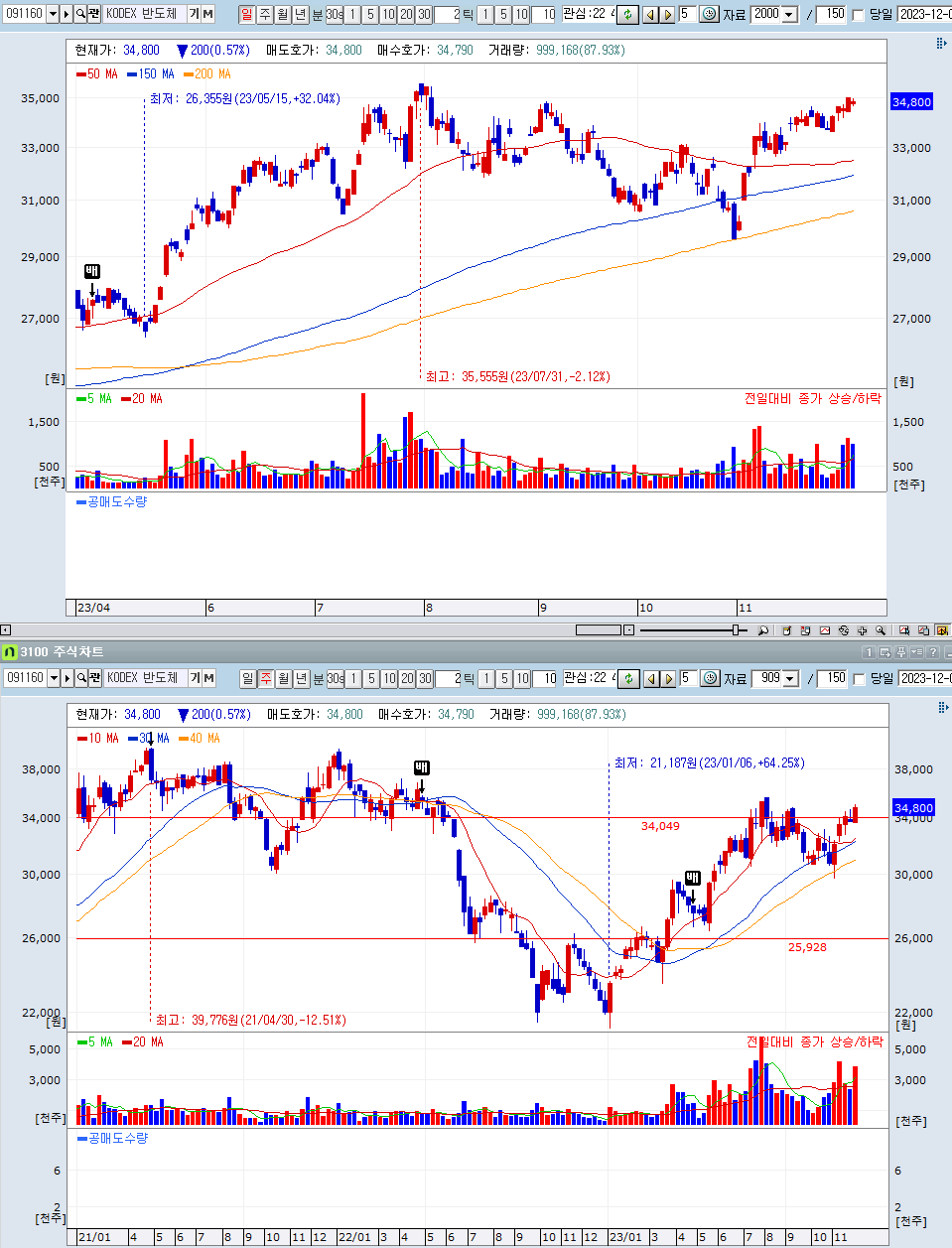 3. 코스피 200, 코스닥 150 : 코스피200은 지속적으로 상승하고 있지만, 매물벽이 많은 구간에 존재하고 있음. 34,000원 구간을 강한 거래량으로 돌파하는 것이 2단계 진입에 중요하게 보임. 코스닥 150은 상대적으로 3단계에 진입하여서 150일 이평선 위아래에서 움직일 것으로 예상. 매물벽이 워낙 강하기에 상승할수록 상승은 제한적으로 보임.
