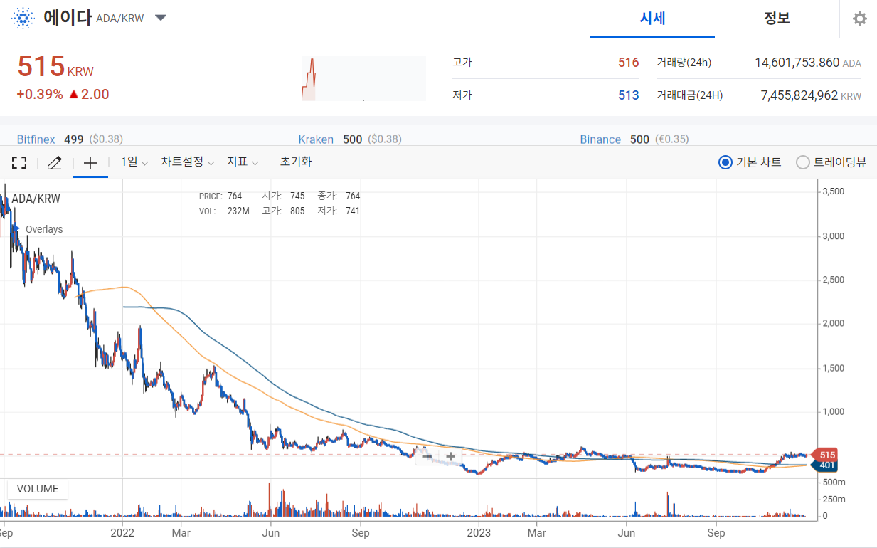 큰 하락없이 상승하는 2단계국면. 차트상으로 대장은 BTC, 솔라나, 그다음 이더 그 다음 에이다. 이 순으로 상승이 넘어갈수 있다. 예전에도 에이다는 상승이 다른 알트보다 늦은 경우가 많았던 것으로 기억. 무튼 추가비중은 없고 적립식 매수는 좋은 수익률을 기록 중. 3단계에 진입한다면 뒤도돌아보지 말고 도망치고 차트로 1단계가 끝날때까지(최소 2년 정도) 관찰만 해야함.