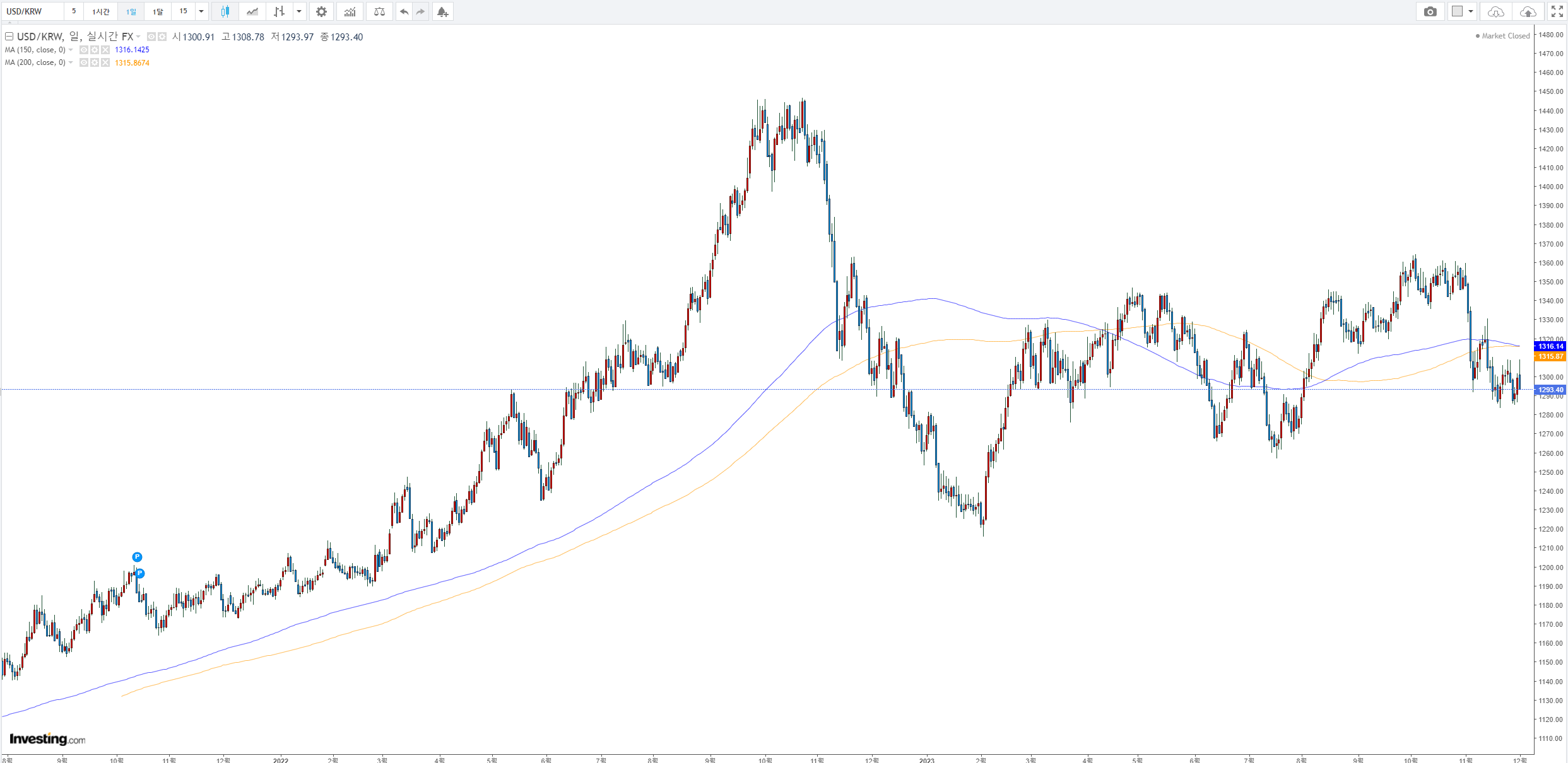 1. 원달러 환율 : 1,300원 전후로 왔다갔다하는 변동성. 단기적저점은 1280원 정도 형성된듯.