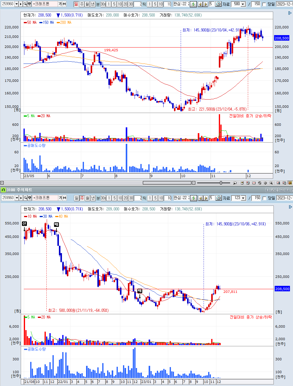 크래프톤은 유의미한 20만 원선 돌파 후 안정적인 가격형성 중. 제약, 바이오주보다는 흐름이 느리지만, 관심 있게 지켜보는. 컴투스 홀딩스는 상대적으로 하락을 많이 하여 크래프톤을 게임업종 탑픽으로 뽑음.
