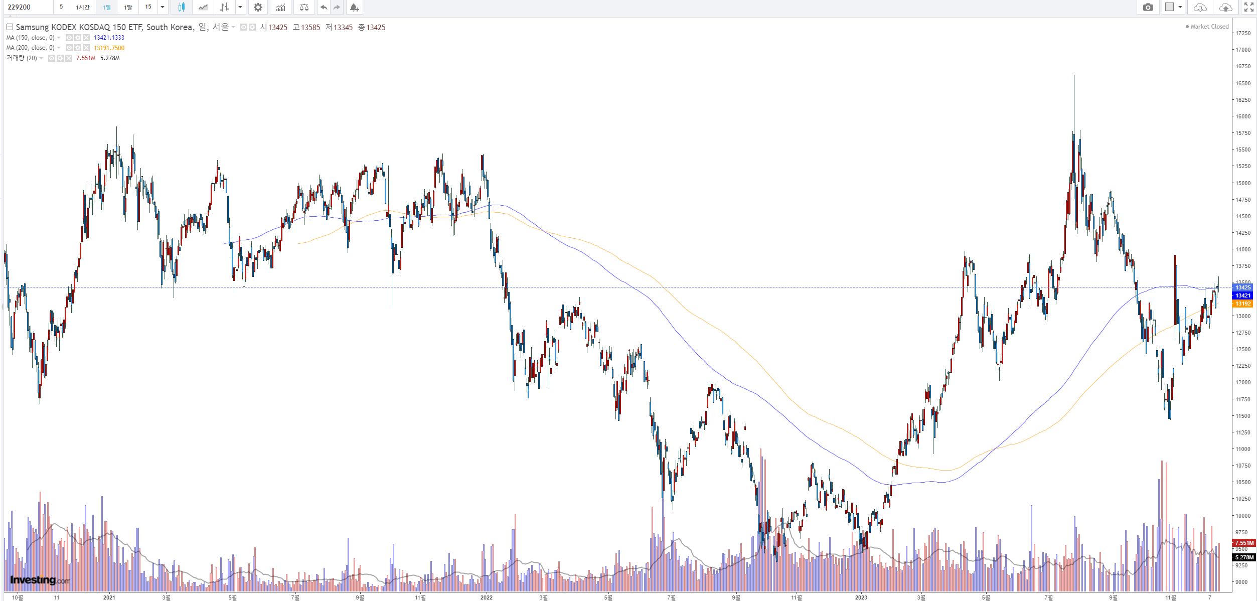 3. 코스피 200, 코스닥 150 : 코스피 지수는 1단계에 있다고 봐야 함. 직전 매물이 많은 상황에서 2600pt를 넘기에고 해당 매물을 소화하기 위해선 시총이 큰 결국 반도체가 상승해 주어야 가능. 코스닥차트는 1단계보다는 3단계에 가까우며 직전 매물벽이 워낙 있고 이평선 아래에서 형성되어 있기에 현재 900Pt를 넘어서기는 쉽지 않음. 이평선은 850Pt 부근에 형성 중.