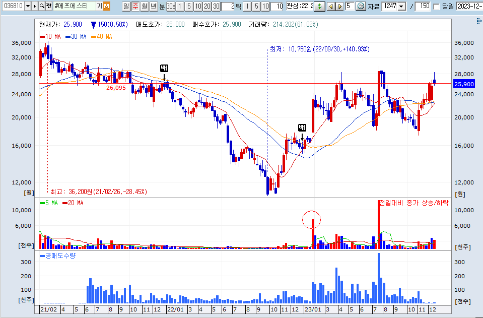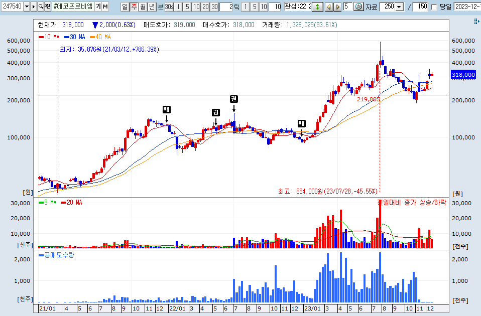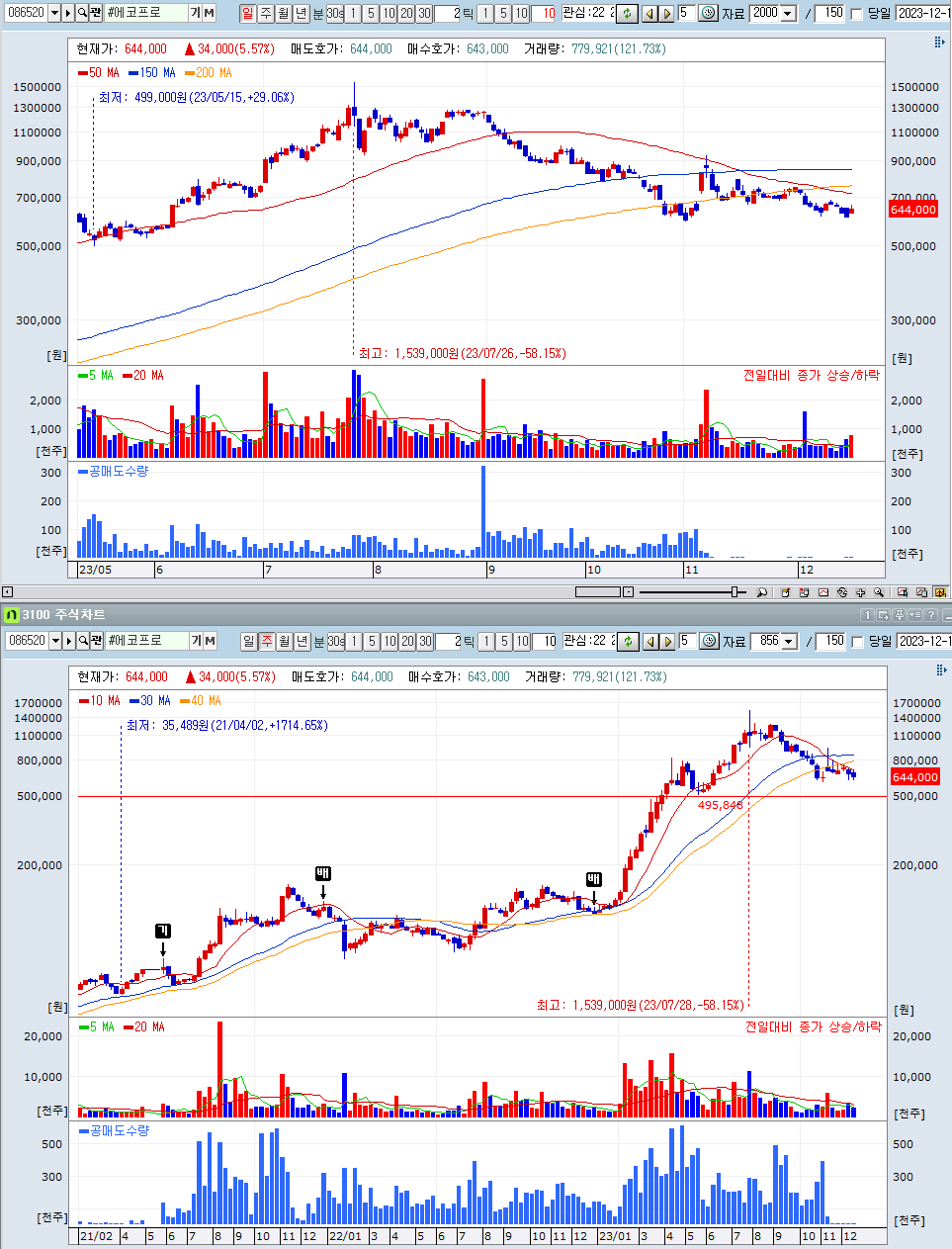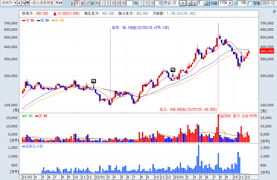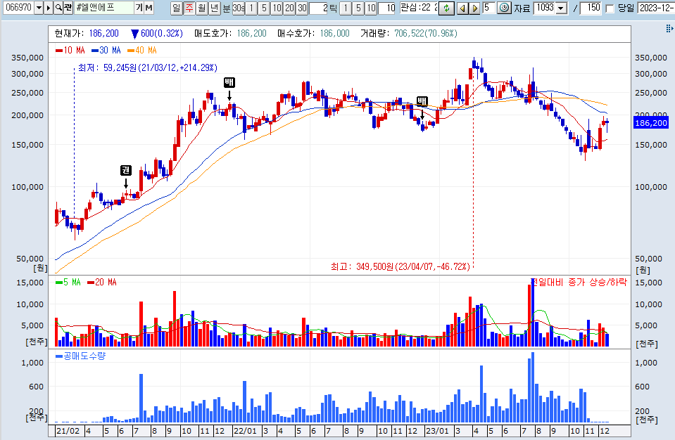 에코프로 머티리얼즈가 신고가를 갱신하며 쉽게 하락하지 않고 있는 상황. 하지만, 에코프로의 차트는 좋지 않고 고점이 하락하는 모습. 에코프로비엠은 이평선 위에 있지만 3단계 진입으로 보고 있음. 엘앤에프의 최근 흐름이 좋지만 과대낙폭에 의한 상승이라고 보고 저항매물이 많아서 추가 상승여력은 크지 않을 것으로 생각. 포스코 퓨처엠도 동일한 관점