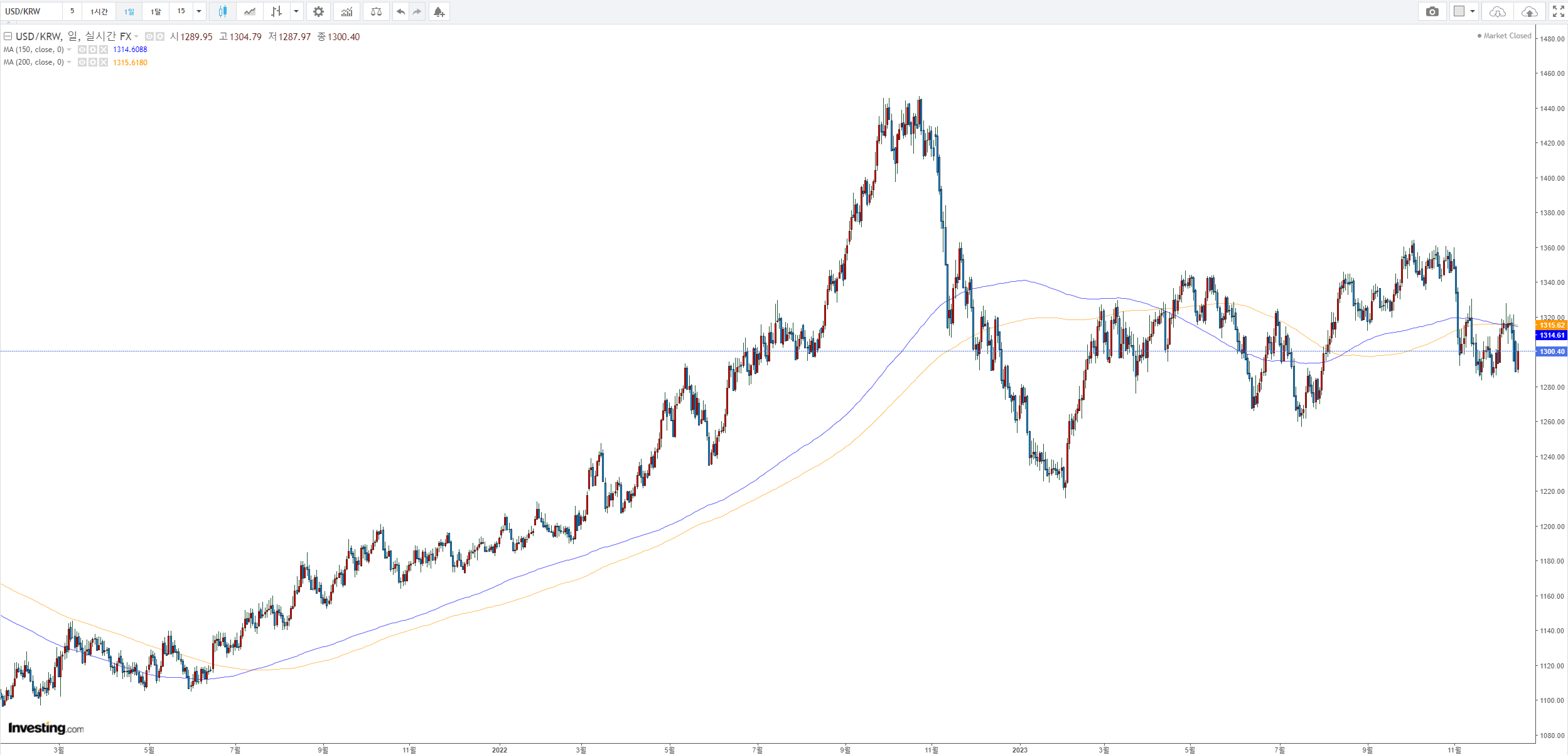 1. 원달러 환율 : 이평선과 가격이 한 곳에 모여있는 시점으로 방향성을 잡지 못하고 있음. 3단계 환율은 하락 쪽으로 보이는 중이다.