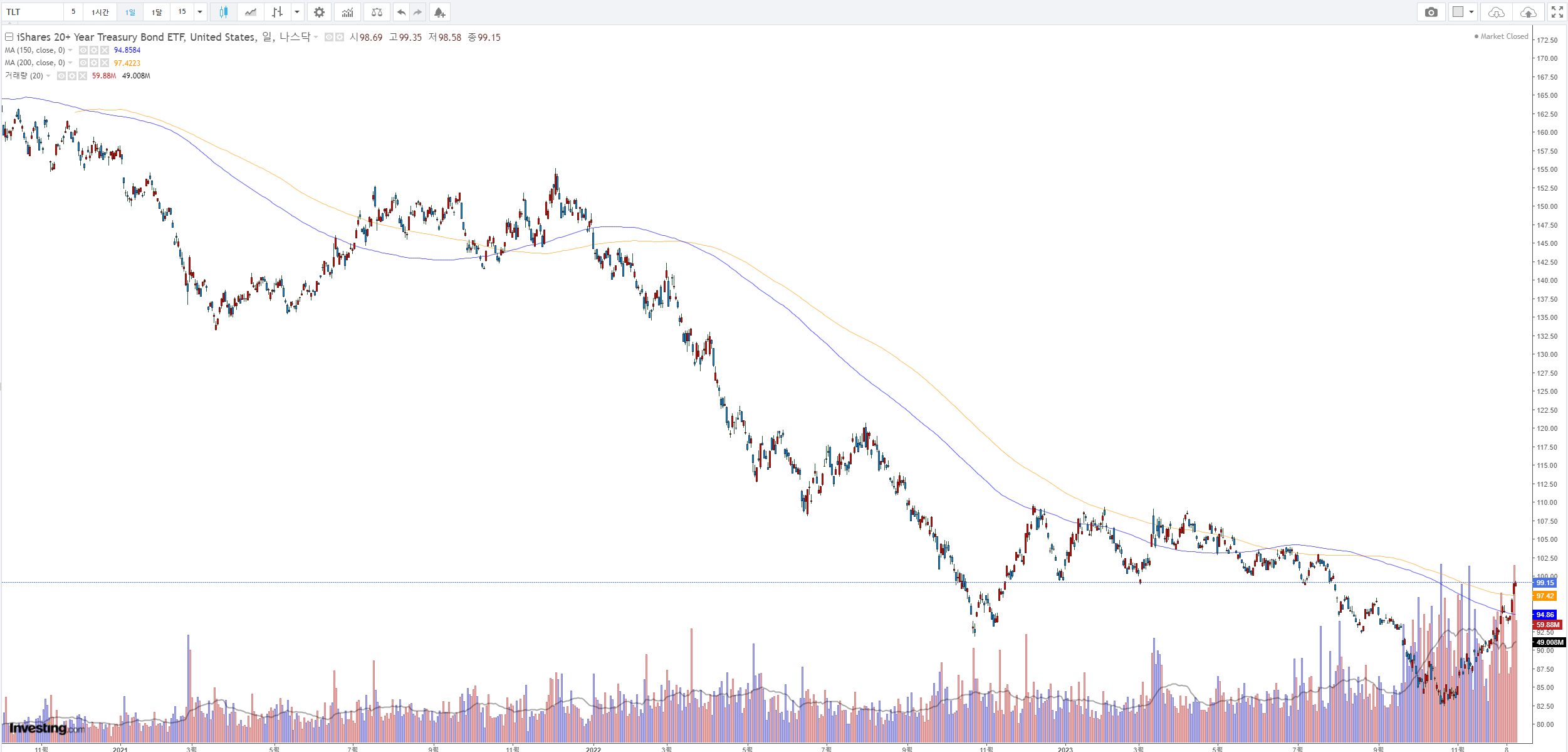4. 채권(TLT, TLTW, TMF) : 1단계 진입시도. 90~100달러 부근에서 횡보하면서 1단계가 진행될 것으로 예상하고 있으며 100 달러 근처부근까지 상승하였음. 4단계 종료를 논하기엔 이를 수도 있지만, 매크로를 고려할 때 1단계 진입으로 보고 있음. 하지만, 급하게 매수해야 한다는 관점은 아님.