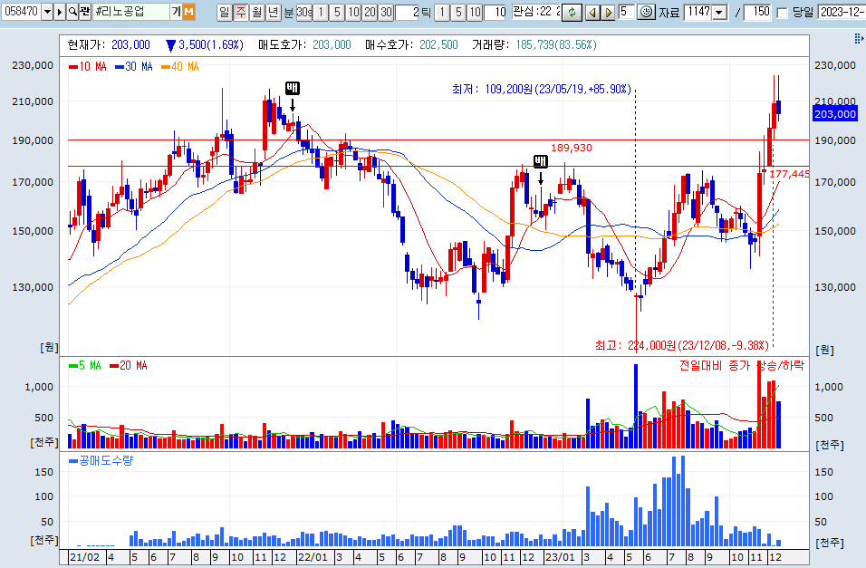 반도체 종목 풀백매수 유효관점. 지난주 하락으로 풀백위치에 있는 종목들이 나옴. 하나마이크론 관심. 리노공업은 최근 주도주로 급부상하고 있으며 전고점 돌파에는 실패하였지만 유의미한 거래량을 보여줌. 19만 원 오면 매수관점. 20만 원 부근에서 22년 고점 매물이 소화되는 시간이 필요하다는 관점.