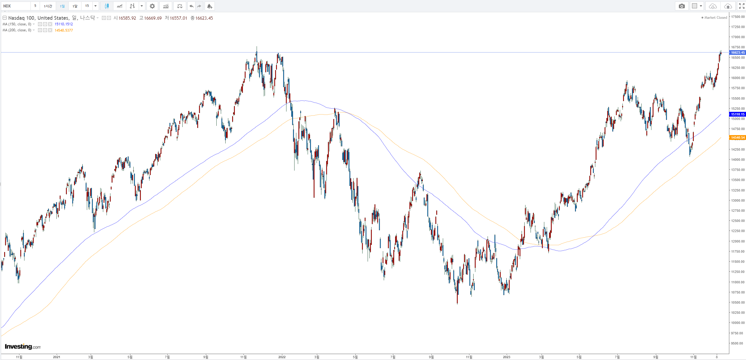 2. S&P 500, 나스닥 100 : S&P 차트가 나스닥 차트보다는 좋은 상태. 둘 다 22년 고점의 매물벽을 뚫어야 하는 상황. 현재 딱 저항선에 닿아있음. 하락한 다면 M자 형태로 차트는 우호적이지 않을 가능성. 22년 유동성장의 가격을 뚫고 올라갈만하냐에 대해서는 부정적으로 보고 있지만 고점을 돌파한다면 새로운 2단계, 상승추세로 보아야 할 가능성도 있음.