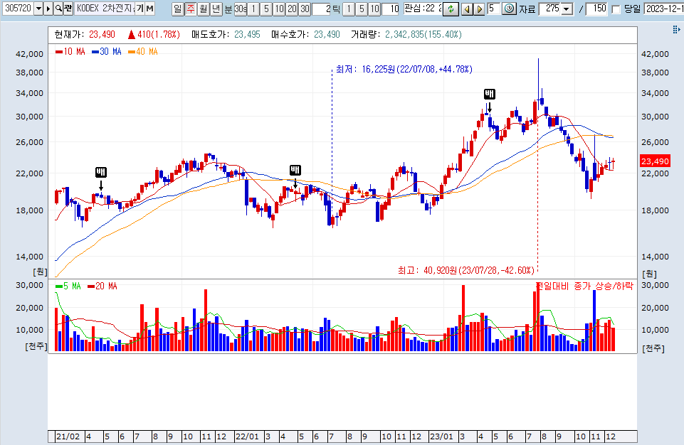 3-2. 하락업종 : 2차 전지 산업 50일 이평선에서 변동성을 축소하며 횡보 중. 에코프로머티의 편입발표로 재료소멸로 인지하고 있음. 사실상 데드크로스 진입. 상방진입은 제한적일 것으로 판단. EUV업종도 3단계로 보임. 엔터, 식품등도 해당.