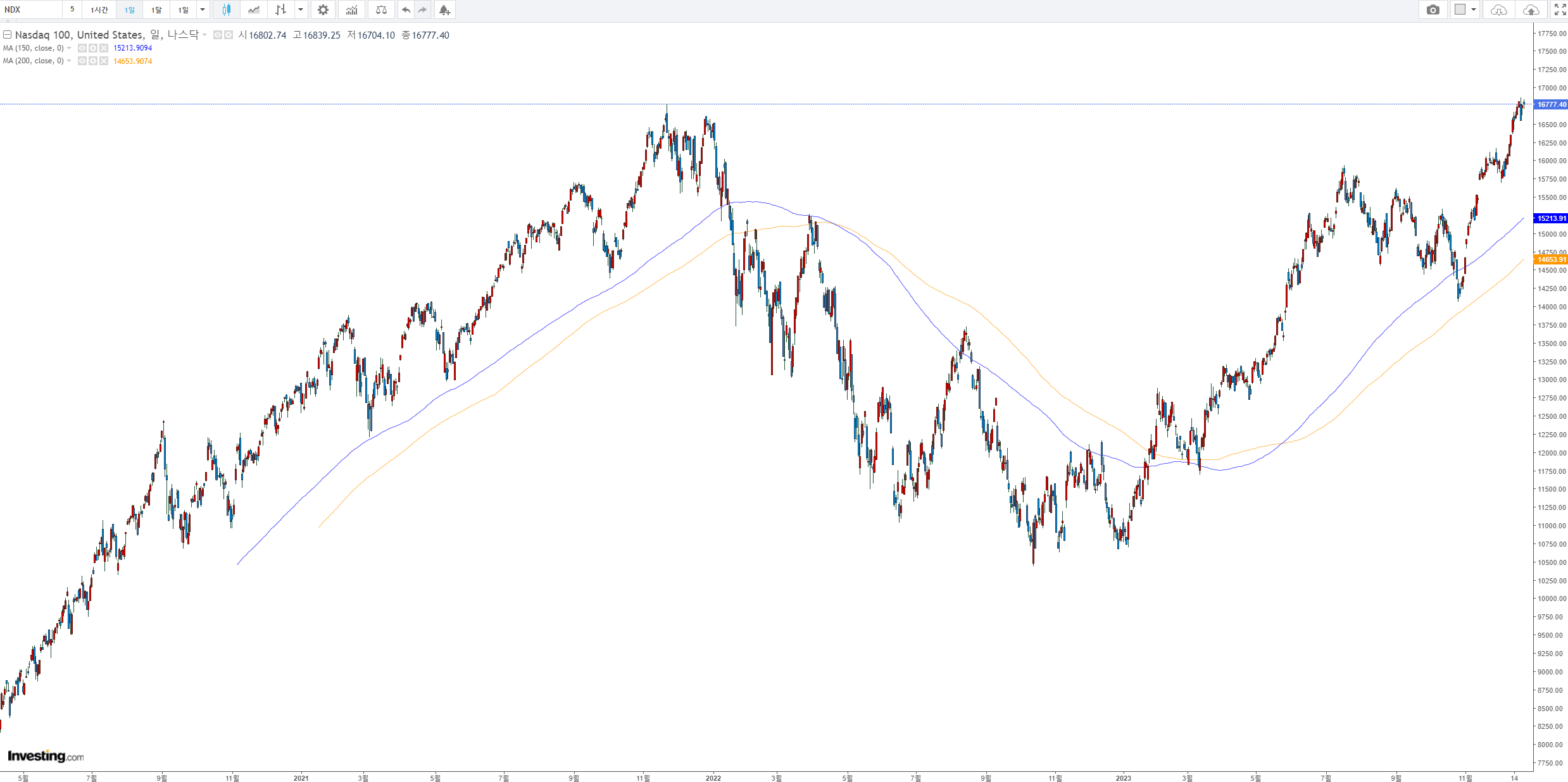 2. S&P 500, 나스닥 100 : 두 차트 모드 비슷한 모양을 그림. 나스닥 100 이외 종목은 상대적으로 부진한 모습. 나도 차트모두 신고가 영역에 도전 중인 모습. 해당 부분에서 돌파를 할지, 횡보 후 돌파를 할지, 방향을 돌릴지는 미지수. 관망이 필요한 시점.