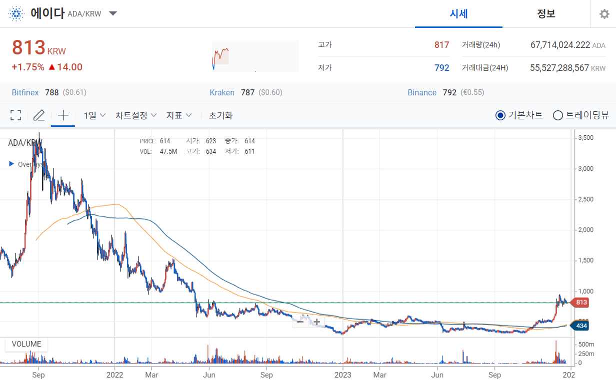 에이다의 경우 1단계 추세선에서 베이스를 다지는 모습. 오래된 매물이지만 매물벽이 많고 하락폭이 커서 큰 상승에서도 매물벽이 있다는 것이 아쉬움. 가장 차트적으로 좋고 하락폭이 적어 상승 후에 매물벽이 없어 무난해 보이는 것은 BTC. 리스크를 부담한다면 SOL가 차트적인 관점에서는 괜찮아 보이지만, TOP픽은 BTC