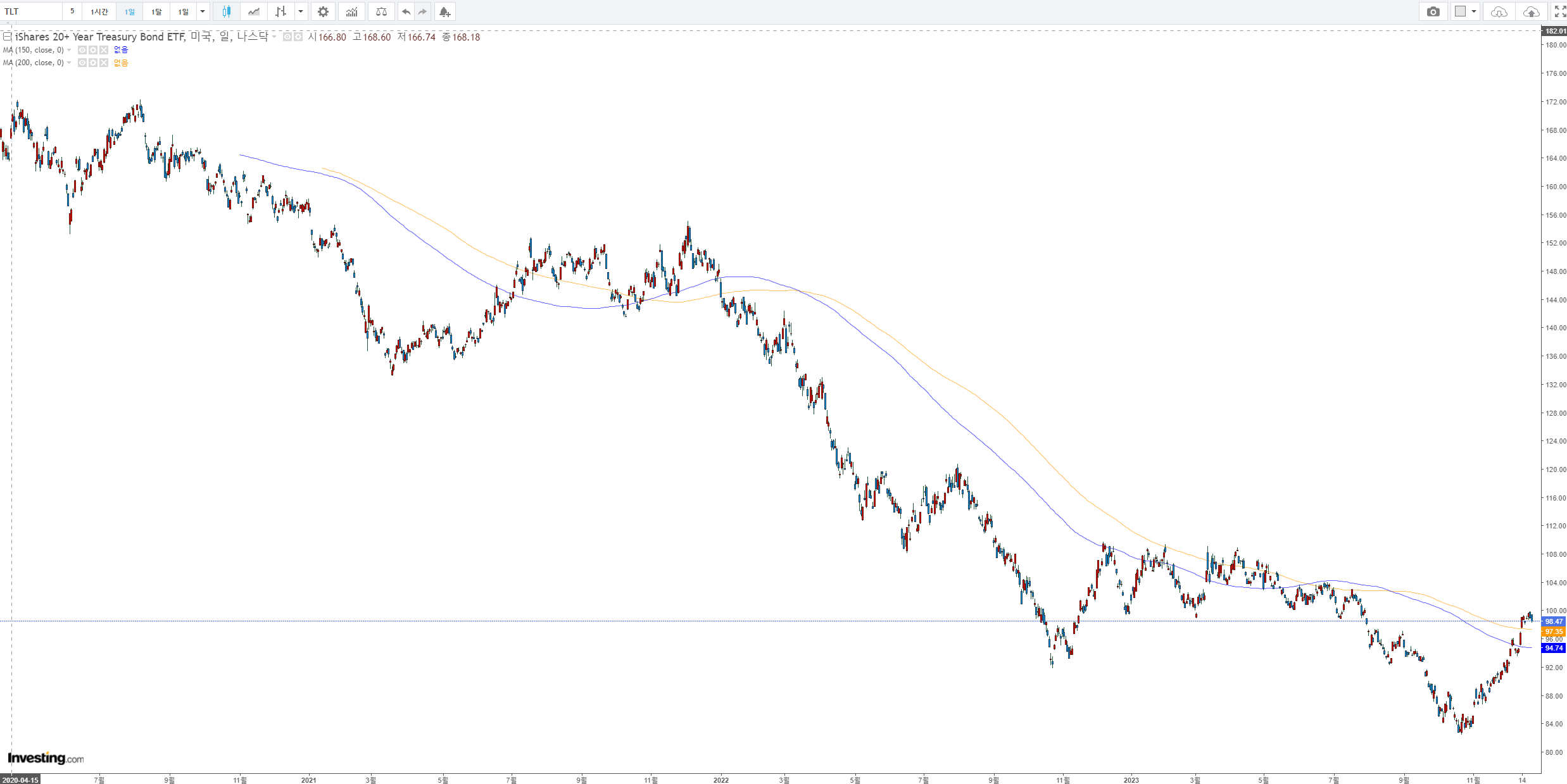4. 채권(TLT, TLTW, TMF) : 90~100달러 부근에서 횡보하면서 1단계가 완성될 것으로 예상. 100 달러 근처부근까지 상승하였음. 4단계 종료를 논하기엔 이를 수도 있지만, 매크로를 고려할 때 1단계 진입으로 보고 있음. 하지만, 급하게 매수보다는 1단계를 충분히 확인할 필요 있음.