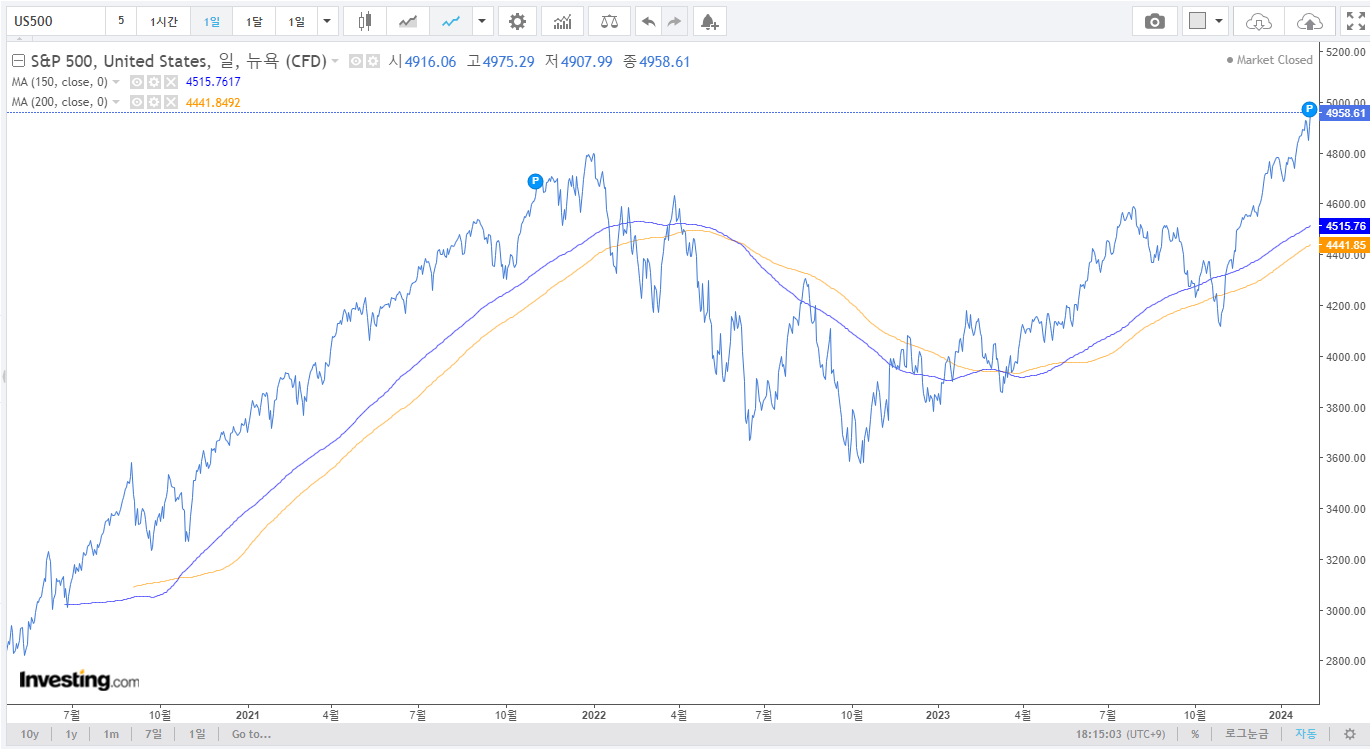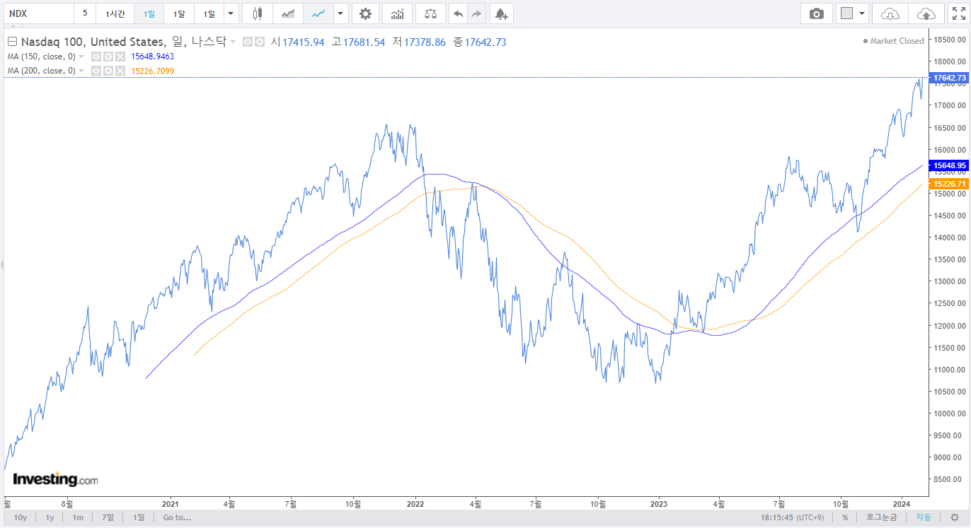 2. S&P 500, 나스닥 100 : 두 지수모두 최고점을 돌파하였음. 2단계 진입하였으며, 상승장에 초입이라고 볼 수 있을 정도의 좋은 흐름이다. 애매한 흐름의 한국보단 좋은 흐름의 미국장에서 투자를 진행하는 것이 좋아보이는 시점임. 미국투자는 환율과 세금이슈가 있어서 귀찮은 부분이 있는데, 현재 코스피-미국채권 자산배분을 하고 있는 크지 않은 금액을 ISA 계좌로 옮겨서 운용해볼까 고민 중임. ISA계좌를 다시 알아보자. 어차피 울트라 미국채권 30년물 같은 것을 운용한다면 ISA를 이용해서 운용하는 경우 큰 이점이 있을 수도 있다.