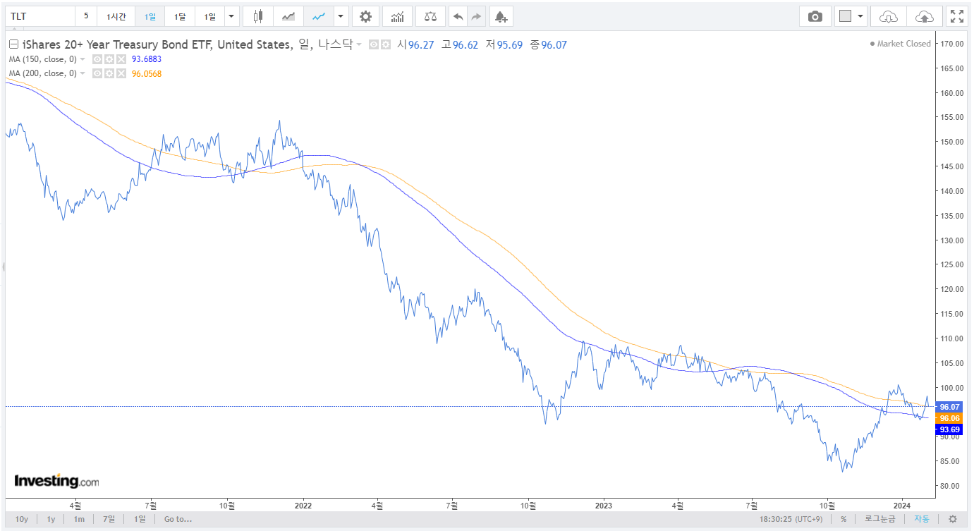 4. 채권(TLT, TLTW) : 90~100달러 부근에서 횡보하면서 1단계가 완성될 것으로 예상. 매크로와 함께 조정을 받고 있음. 90달러가 단기적인 저점이라고 생각하고 있었음. 이제 150일 이평선 위로 올라왔으니 150일 이평선의 지지를 생각하고 매매할 수 있는 시점이라고 보고 있음. 울트라 미국채를 매수하기 위해서는 ISA계좌로 운영하는 것이 효율적이라고 판단할 수 있어서, ISA 계좌와 해당 ETF 를 다시 공부해보고 해당 계좌를 운용해볼까 고민 중. 당연히 레버리지를 사용하는 금액은 TLT or TLTW를 매수하여 분배금으로 이자비용을 충당해야하고, 내 돈으로 매수하는 금액은 분배금이 없어도 괜찮기 때문에 ISA로 운용하는게 고려대상임.