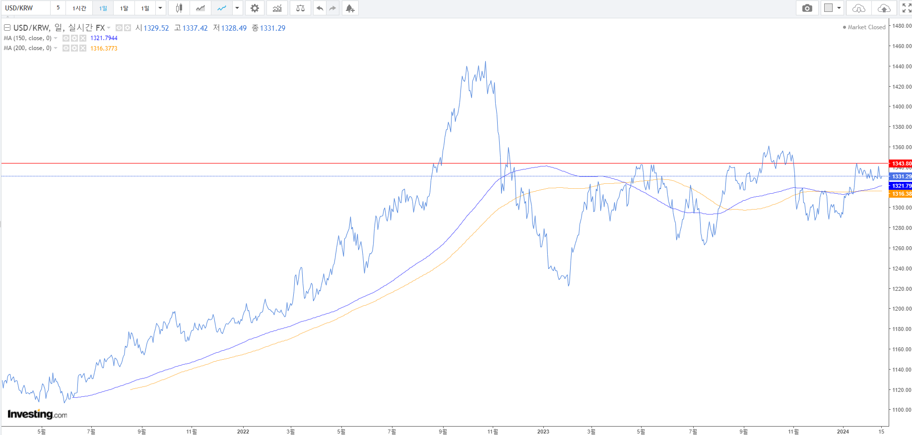 1. 원달러 환율 : 이평선과 가격이 한 곳에 모여있는 시점으로 방향성을 잡지 못하고 있음. 단기 고점은 1,340원 부근으로 보인다. 크게 관찰할 것이 없으며, 인사이트도 없다.