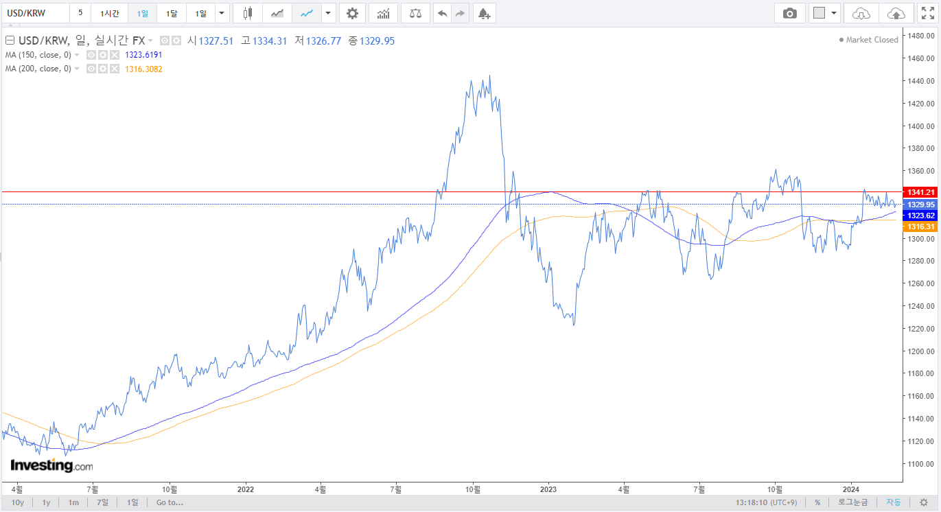 1. 원달러 환율 : 이평선과 가격이 한 곳에 모여있는 시점으로 방향성을 잡지 못하고 있음. 단기 고점은 1,340원 부근으로 보인다. 금리인하 지연 이슈로 살짝 하락하였다.
