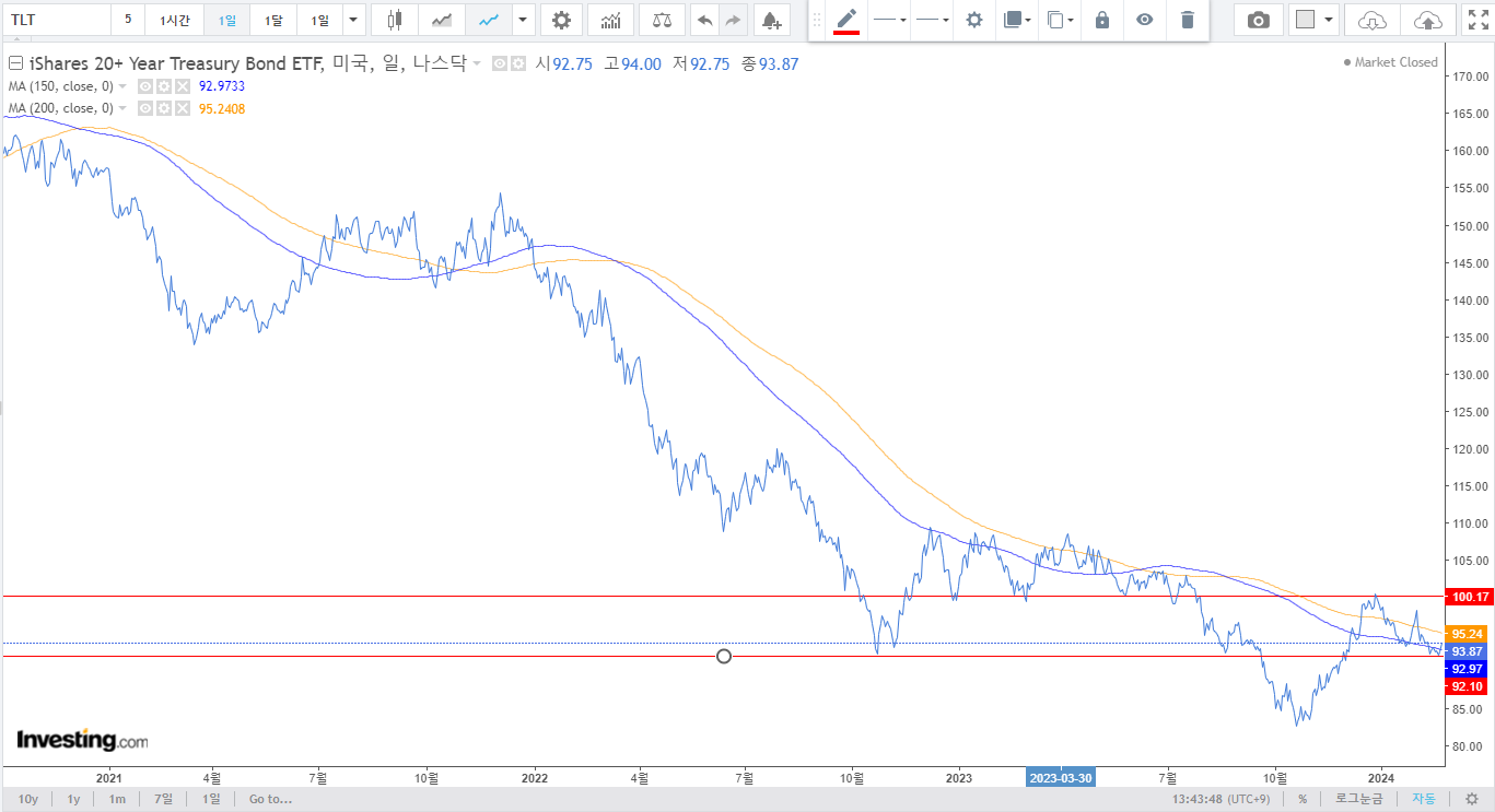 4. 채권(TLT, TLTW) : 90~100달러 부근에서 횡보하면서 1단계가 완성될 것으로 예상. 매크로와 함께 조정을 받고 있음. 90달러가 단기적인 저점이라고 생각하고 있었음. 이제 150일 이평선 위로 올라왔으니 150일 이평선의 지지를 생각하고 매매할 수 있는 시점이라고 보고 있음. 확인결과 한국상장된 30년물 커버드콜 옵션 미국채가 상장되어 있었음. ISA 계좌에 편입시켰음. ISA 계좌 투자금이 제한적이어서 비중은 작은 상태. 비중이 늘어나면 자금추가납입예정. 추가로 환노출 30년물 상품도 생겼음. 굳이 환전 후 투자할 이유가 사라졌음. 연금저축포트에 편입하였으며, 연말에 DC로 이전하여서 퇴직금도 운용할 계획. 현재처럼 기대감이 줄어들 때 모아가기 좋은 타이밍이라고 판단 중.