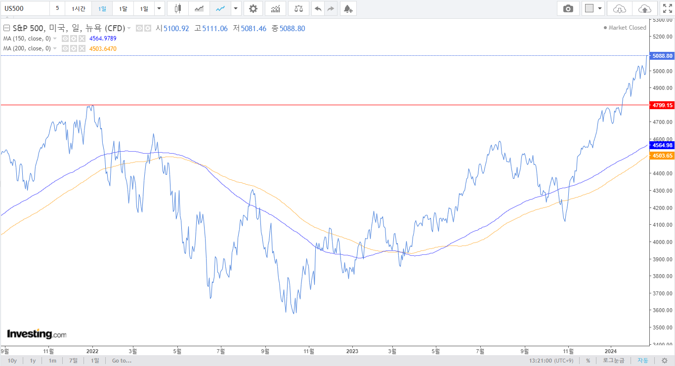 2. S&P 500, 나스닥 100 : 두 지수모두 최고점을 돌파하였음. 2단계 진입하였으며, 상승장에 초입이라고 볼 수 있을 정도의 좋은 흐름이다. 애매한 흐름의 한국보단 좋은 흐름의 미국장에서 투자를 진행하는 것이 좋아 보이는 시점임. 버블논란이 있다. 이평선 이격이 어느 정도 있다. 풀백을 보는 것도 좋아 보이기도 한다. S&P는 전고점대비 약 6%, 나스닥은 약 7% 정도 올라간 상태. 미국, 일본이 포함되어있는 선진국 지수는 상향돌파, 2단계 달리는 중