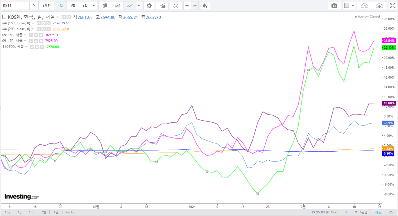 3. 코스피, 코스닥 : 코스피 흐름 나쁘지 않았음. 다만 매물벽이 많은 시점인데, SK하이닉스와 저 PBR주의 상승이 이어졌음. 2,700pt에 도전할 것으로 예상됨. 26일 정부의 발표와 반도체의 흐름을 주시. 배당락 이슈도 고려대상. 코스닥의 경우 이평선을 돌파하였음. 코스피와 대조적으로 가까운 곳에 매물벽이 많아서 900pt 돌파는 어렵다고 보고있으며 트리거도 상대적으로 적다고 생각. 2차전지가 코스닥에 영향을 크게 미치는 것은 맞지만 작년 10월 이후 데이터를 비교하였을 때 언더퍼폼하는 업종으로 숏에 대한 관점은 유지.
