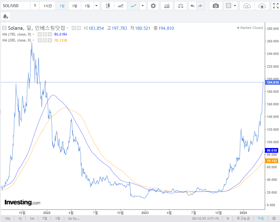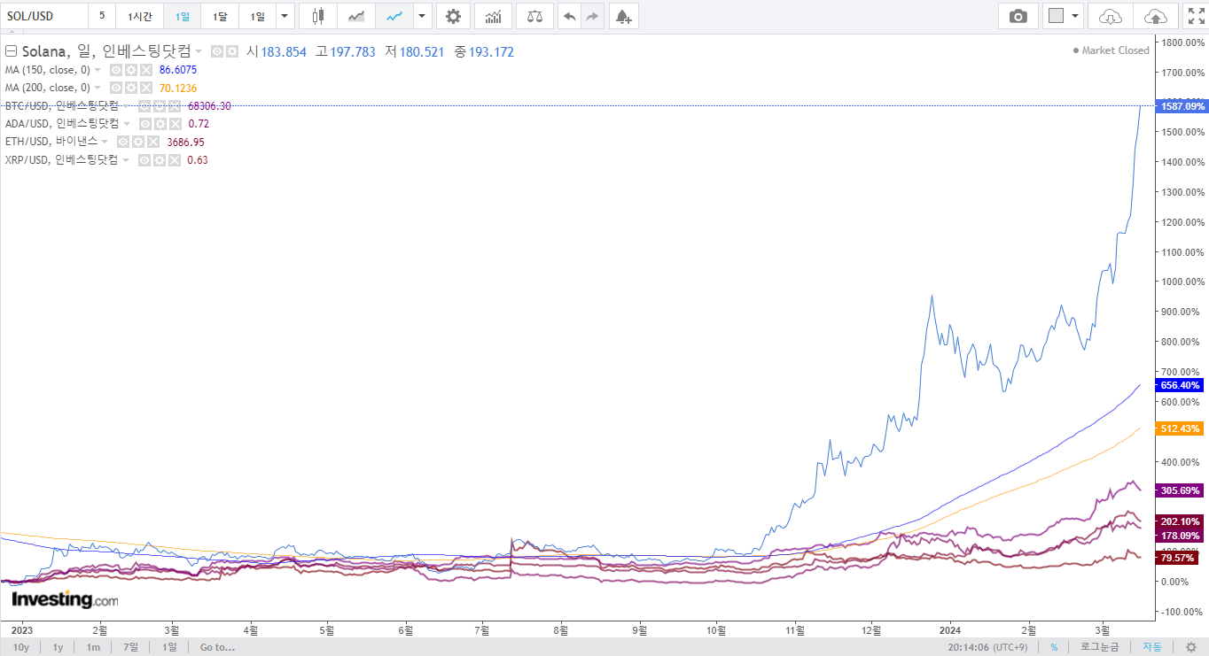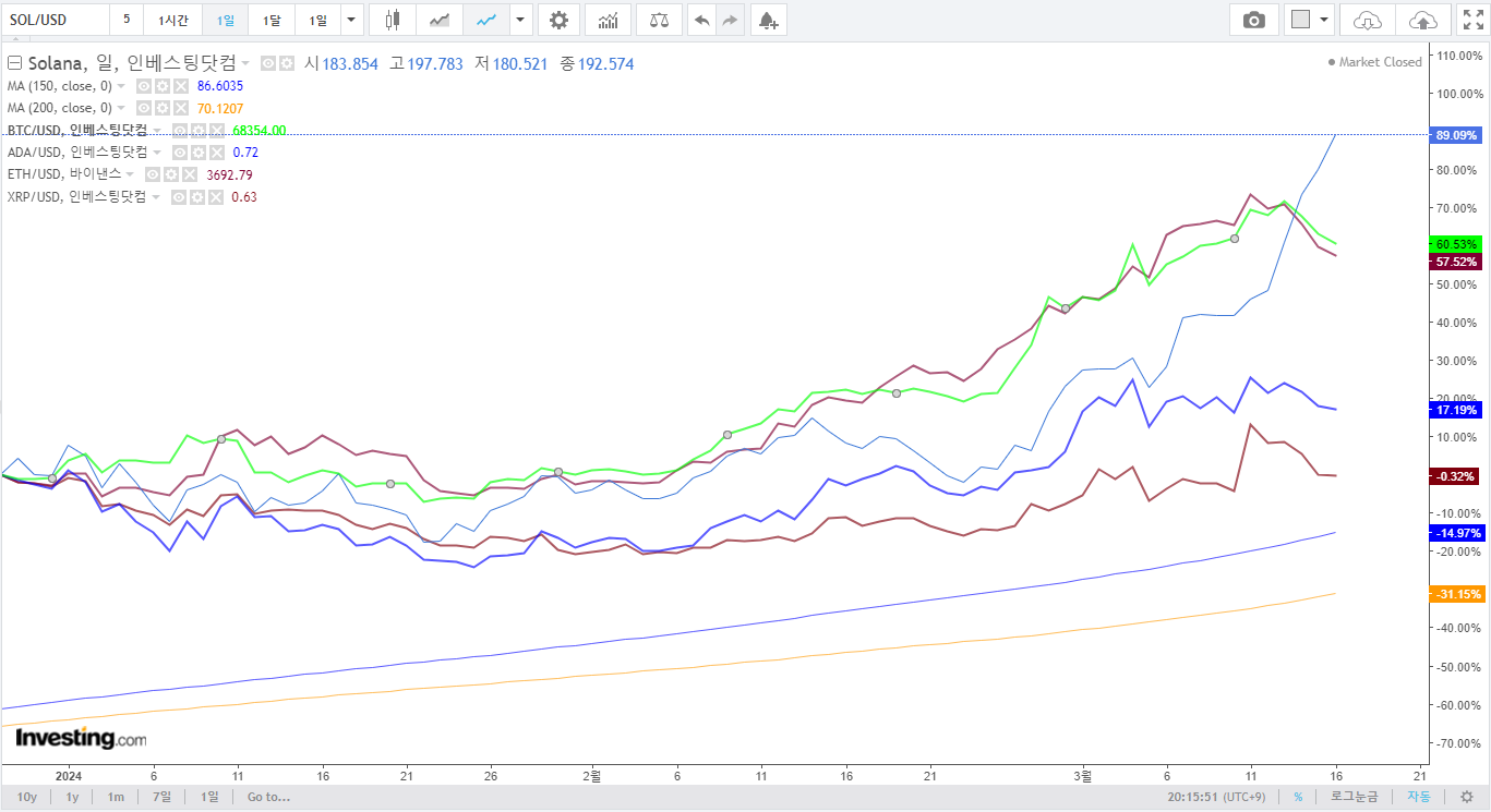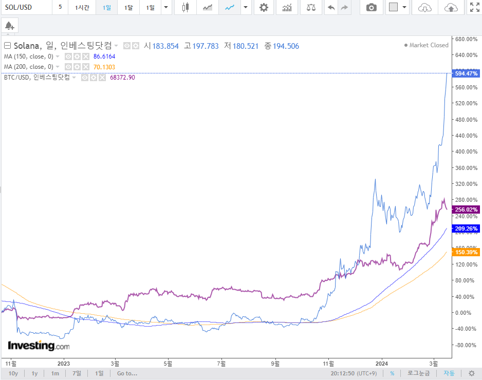 업비트에만 상장된 코인은 조금 리스크 하다 판단되어서 바이낸스에 동시상장된 코인에서 차트가 좋은 코인을 선별하였고 그중 매물벽이 없고 거래량이 양호한 친구들로 선별하였음. 솔라나 돌파매매 성공. 아비트럼은 매도. 솔라나의 성과가 BTC 대비 상대적으로 강하다. 저점에서 상대적인 성과도 굉장히 우수한 편이다. 23년부 터보 아도 24년부터 보아도 말이다. 아비트럼을 매도한 금액으로 솔라나 풀백 때 매수를 고려해 볼 예정.