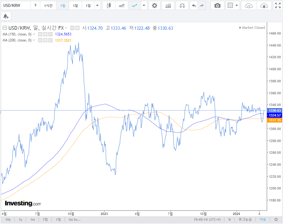 1. 원달러 환율 : 이평선과 가격이 한 곳에 모여있는 시점에서 이평선을 하방돌파하였으나 반등하면서 올라왔다. 아직 하락세라고 보기에는 어렵고 이 구간에서 특별한 이벤트가 나올 때까지 횡보할 것으로 예상하고 있다.