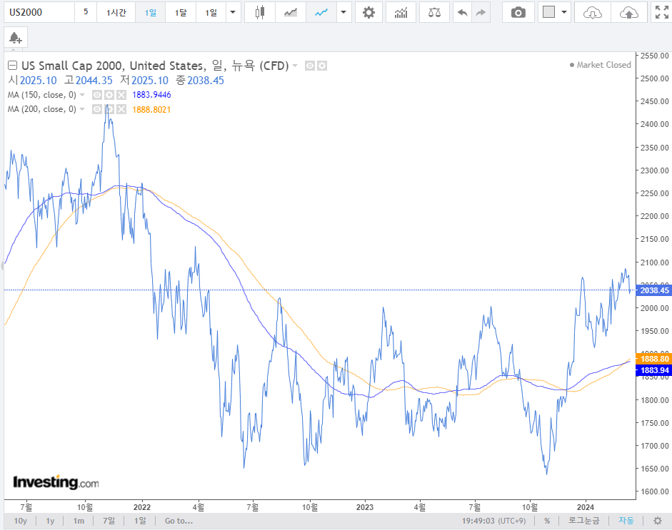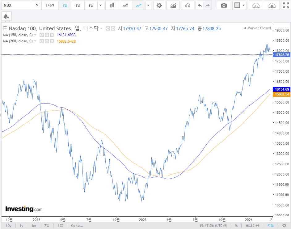 2. S&P 500, 나스닥 100 : 2단계에서 열심히 달리고 있는 시점. 살짝 하락하였으며 이격이 조금 벌어진 상황이 지속되고 있음. 약간의 이슈가 있긴 하지만 여전히 강세이다. 베이스가 나올 수도 있다. 러셀지수는 이제야 1단계를 벗어나려는 시도를 하고 있으며, 러셀지수가 2단계에 진입한다면 대표지수 모두 좋은 상승추세라고 볼 수 있을 것 같다.