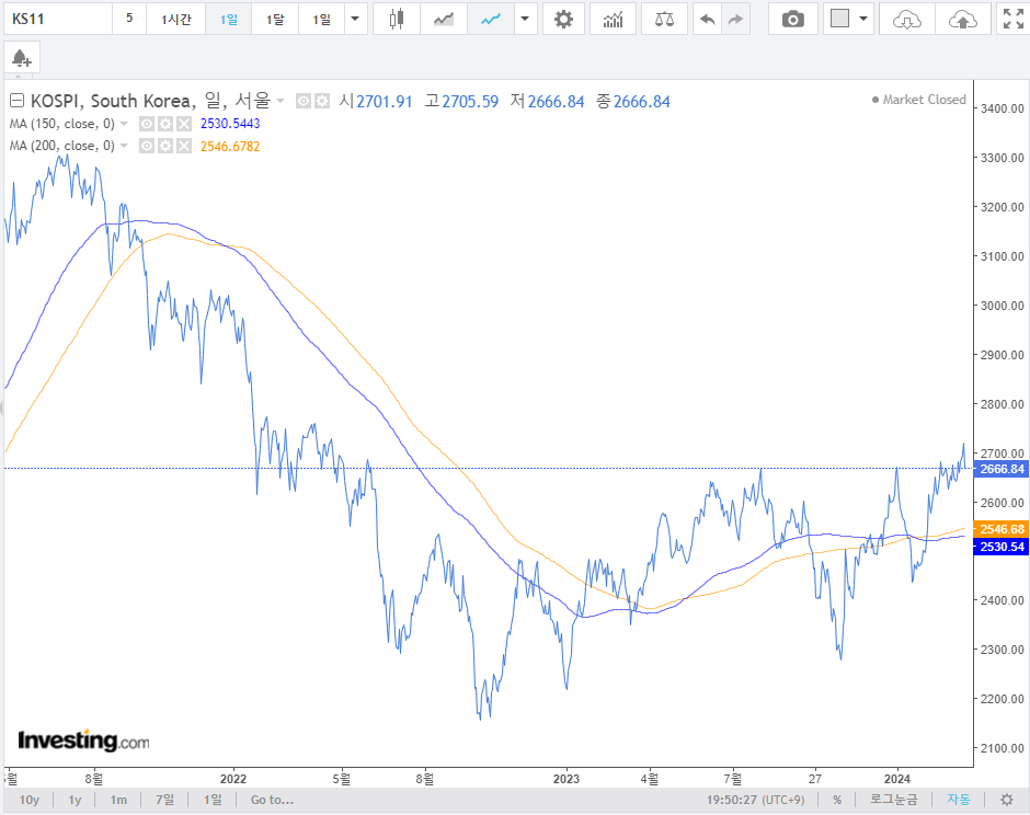3. 코스피, 코스닥 : 코스피는 2,700pt를 찍고 살짝 조정을 받았음. 다음 주의 흐름에 따라서 2단계 진입을 할 가능성도 있다. 저 PBR의 성과가 좋았으며 반도체가 약간 시들하였으나, 둘의 흐림이 좋은 순간 2,700pt 이상 돌파하면서 2단계 진입이 가능하다고 본다. 하지만 매물벽이 2,900pt, 3,050pt 등 많다. 코스닥도 견조한 흐름을 보여주고 있지만 매물벽이 근방에 있으므로 900, 950pt를 뚫고 돌파할만한 재료나 이벤트가 아직은 보이지 않는다. 2차 전지의 강세를 기대하긴 어렵다고 본다.