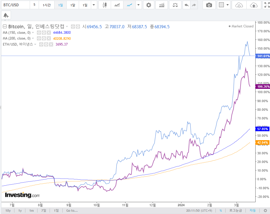가장 퍼포먼스가 좋은 자산군으로 현재는 BTC가 ETH보다는 살짝 아웃퍼폼 하고 있는 초기상승장으로 보고 있음. 달러기준으로 신고가 돌파. 코인을 볼때에는 달러기준으로 보는 게 조금 더 정확하다고 생각한다. 김프가 상당히 높은 편이다. 이는 두 가지를 이야기해 주는데 현재 상승장이며 상대적으로 과열이라는 지표지만 상승뷰이다. 단기돌파매매보다 중기 돌파매매가 용이할 것으로 보고 있음. 보유 ADA 중 일부를 차트가 좋은 솔라나와 아비트럼으로 스왑 하였음.