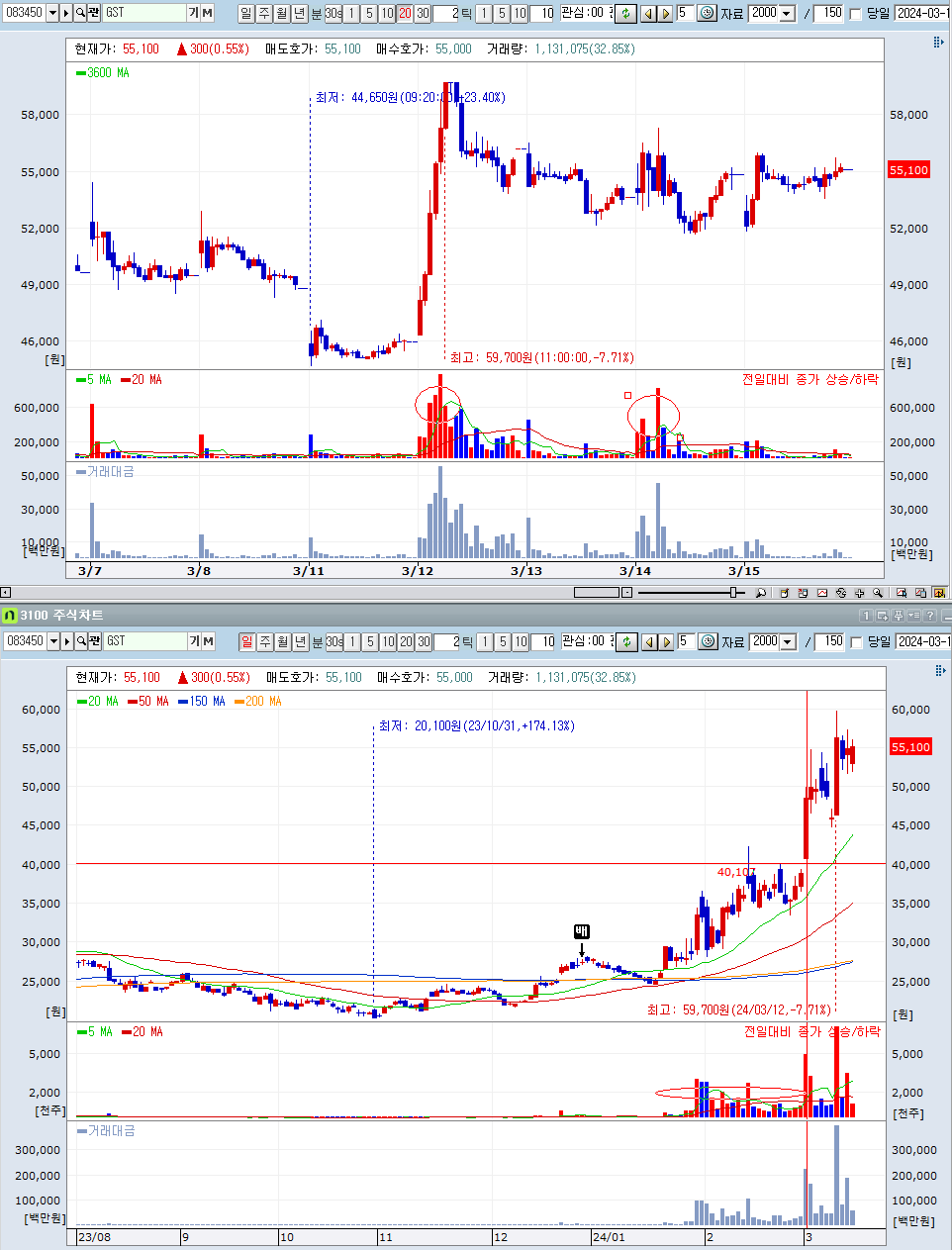 2024년 3월 12일 화요일 : 레이크 머티리얼즈 돌파매매 실패. 적당한 손절. 에스티아이 풀백위치에서 재매수.