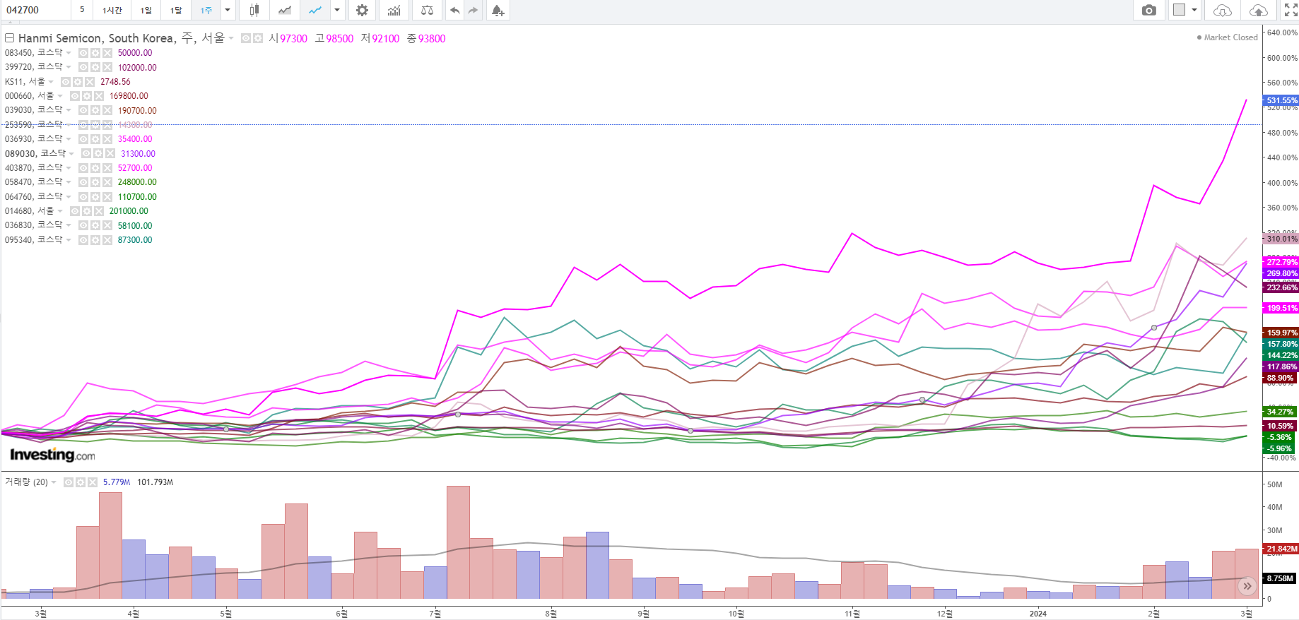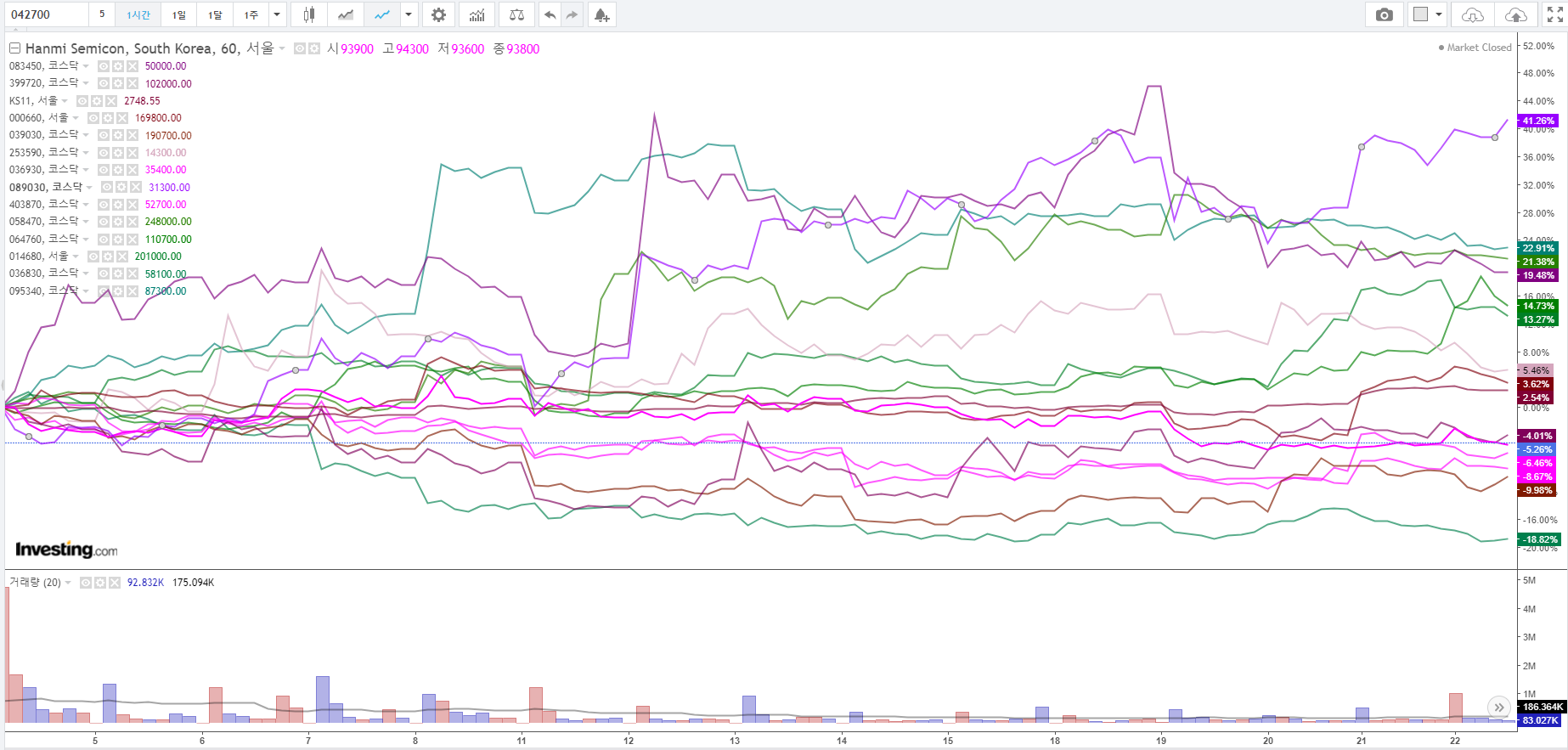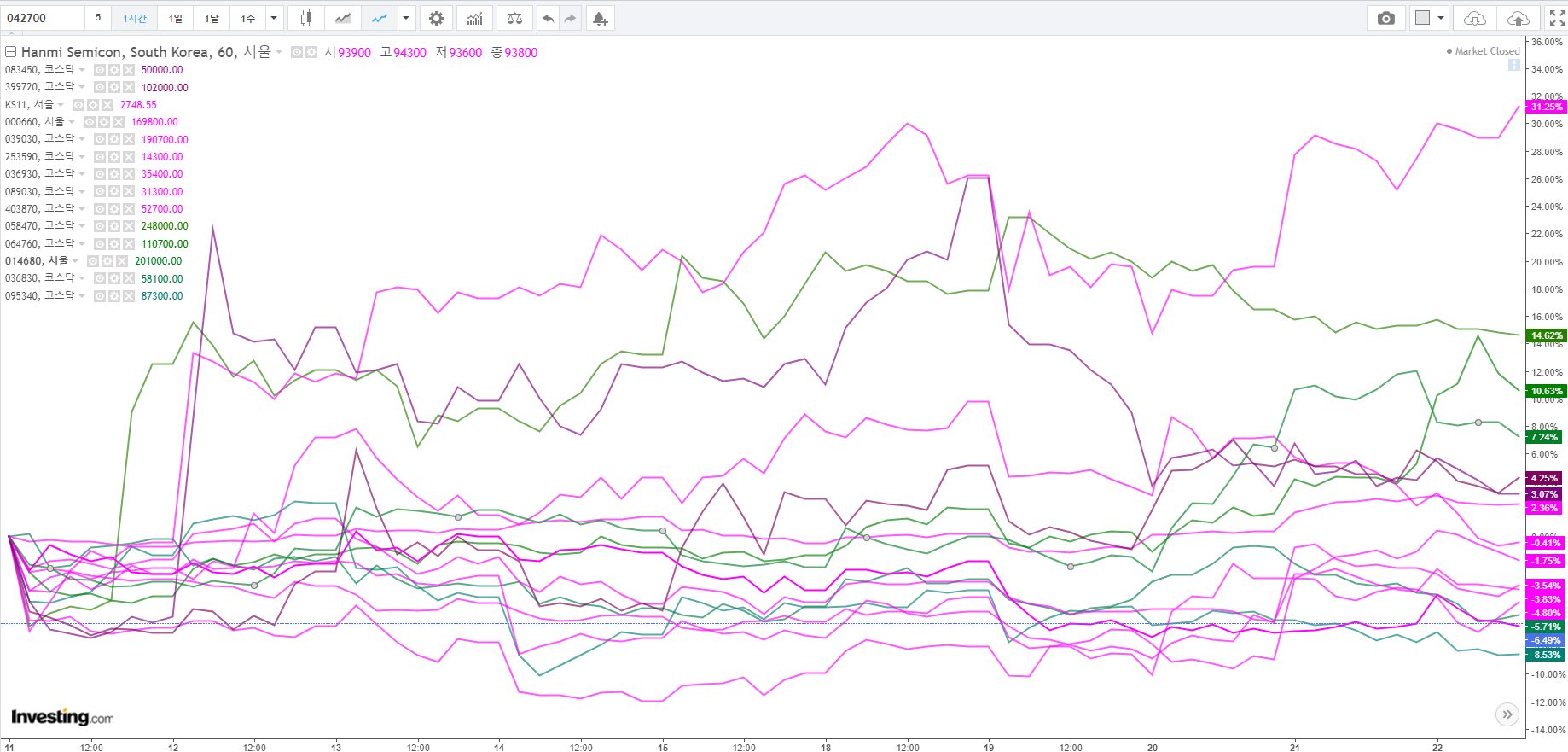 자주색 계열이 장비주 주도주이며, 초록색이 유명한? 소재 및 부품주. 한 주짜리 시계열로는 장기적으로 장비주의 우세.