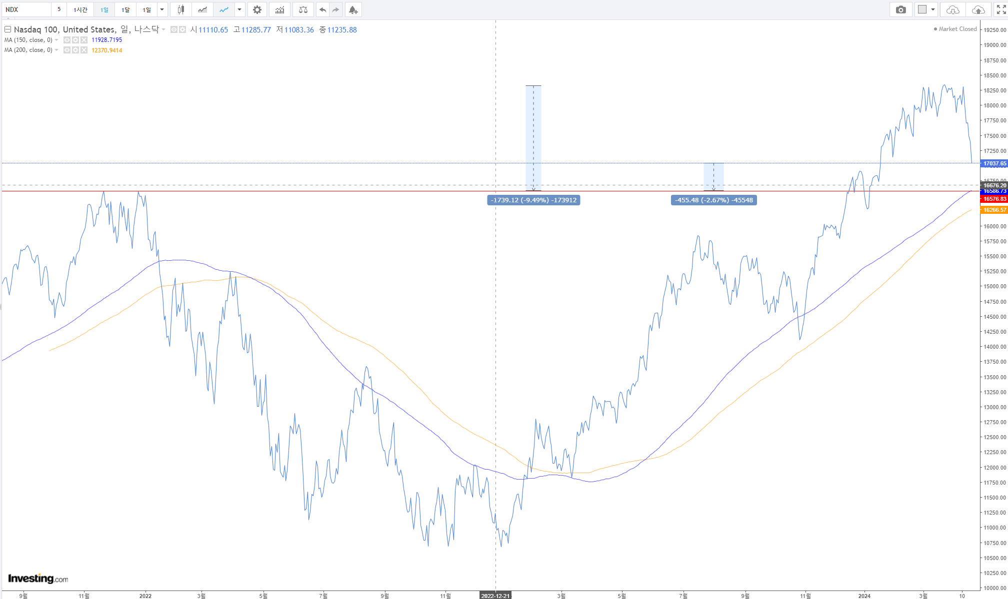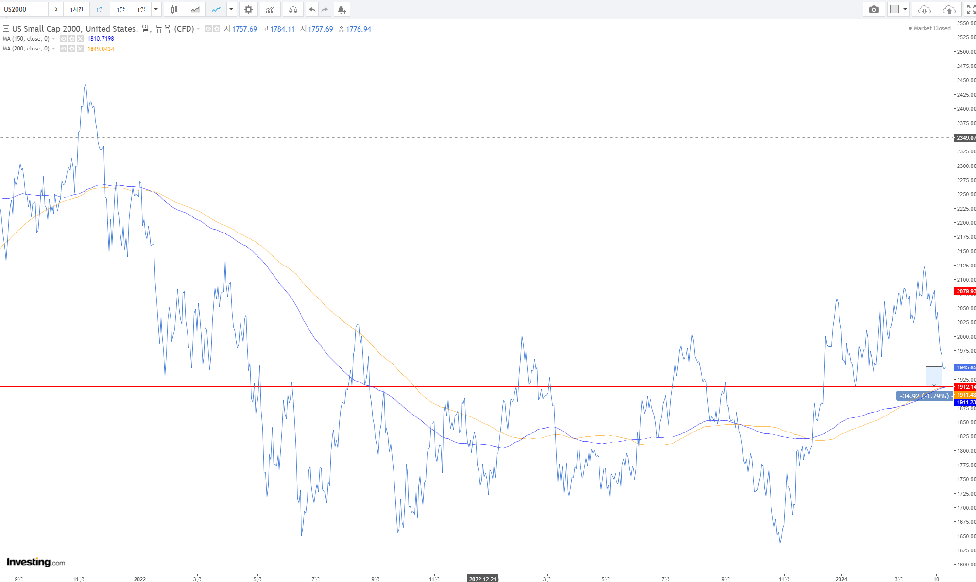 2. S&P 500, 나스닥 100 : 조정이 나올만한 자리에서 조정이 나왔음. 전고점까지는 아직 많은 룸이 약 3% 정도로 남아있긴 함. 현재 생각하는 적당한 케이스는 횡보가 계속되면 이보다 살짝 위에 이평선이 위치하게 되고 그 위에서 지지를 받을 가능성이 높다고 생각. 러셀지수는 2단계 돌파하였다가 현재 조정받아서 1단계 고점에 위치하고 있음. 현재위치에서 더 하락한다면 다시 1단계로 분류해야 할 수도 있다.