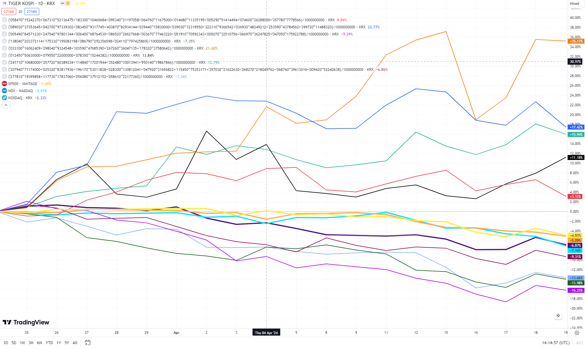 각 업종별 관심종목으로 지수를 만들었음. 3월 이후 수익률 하회하는 업종은 2차 전지, 은행등. 상회하는 업종은 방산, 화장품, 전력기기, 반도체 장비, 반도체 소재등.