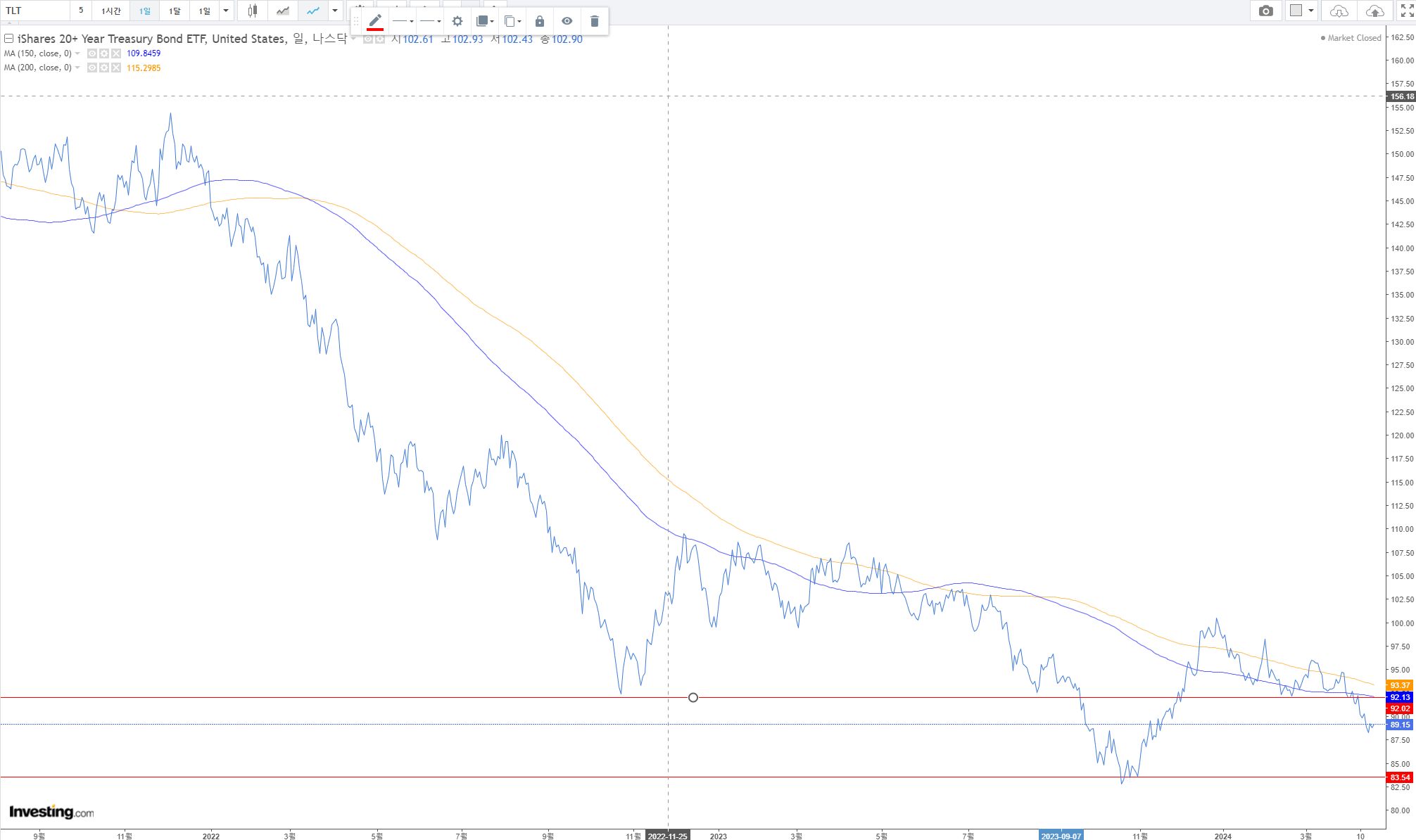 4. 채권(TLT, TLTW) : 90~100달러 부근에서 횡보하면서 1단계 완성이라고 보았으나, 매크로 이슈로 다시 횡보. 1단계. 내가 본 박스권 최하단이라고 생각하고 있으며 매수하기에는 괜찮은 시점이지만 하락 후 반등할 때 매수하는 것이 조금 더 일반적이며 아직 ISA계좌 이슈가 있어서 매수는 어려움. 일단 $85~90 정도 박스권을 생각하고 있음.